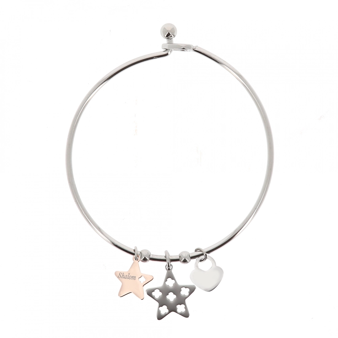 Bracciale rigido tubolare, con chiusura a incastro e ciondoli bicolore: uno un po' più grande traforato color argento e uno un po' più piccolo dorato con incisione "Shalom", entrambi a forma di stella. Questo bracciale è un oggetto raffinato e significativo da regalare e regalarsi! Prodotto realizzato in acciaio di ottima qualità.