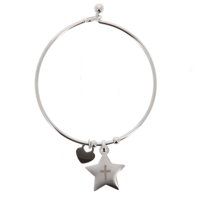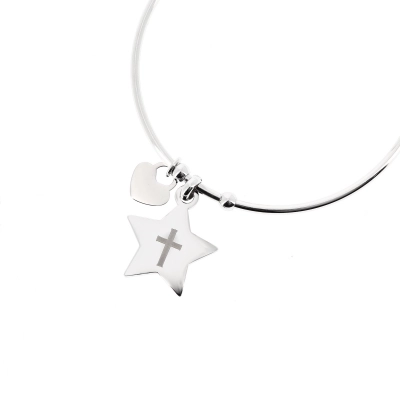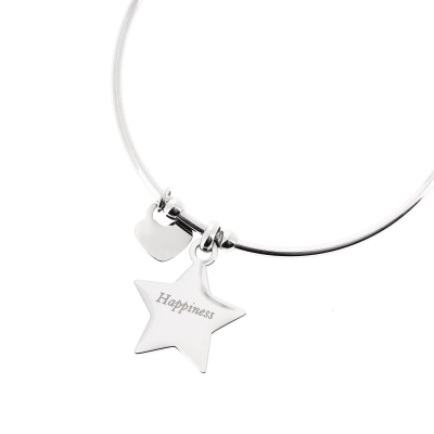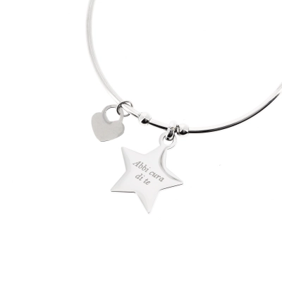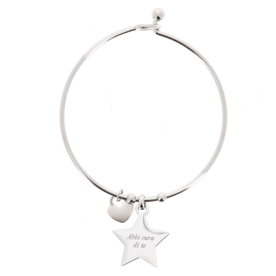 Bracciale rigido tubolare, con chiusura a incastro e ciondolo a forma di stella con incisione. Le incisioni disponibili sono una croce stilizzata; "Happiness", parola che significa Felicità, quella che tutti ci meritiamo; "Abbi cura di te", dolce monito per una persona speciale. Prodotto realizzato in acciaio di ottima qualità.