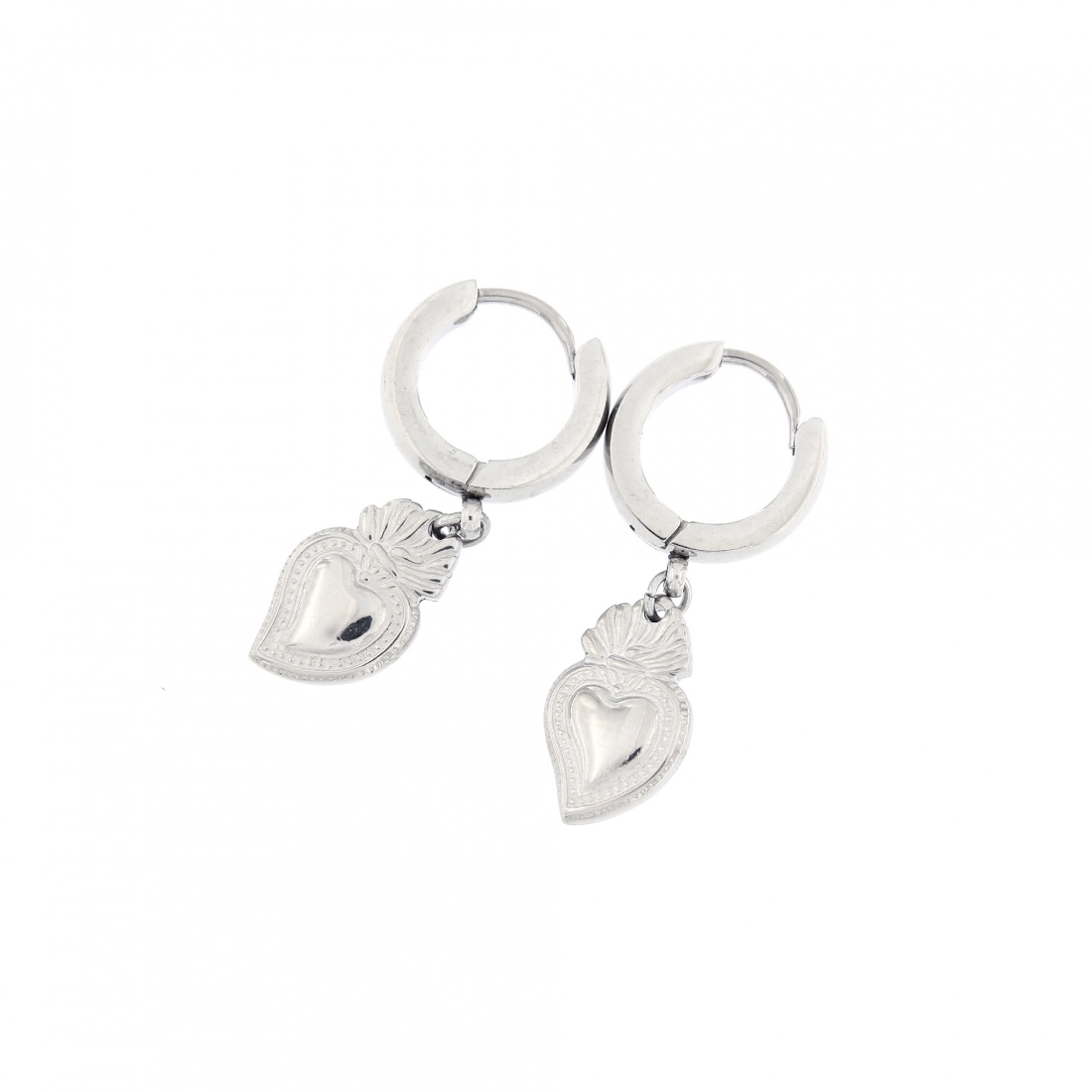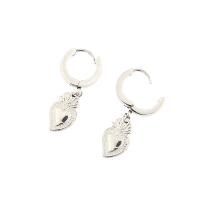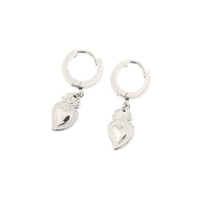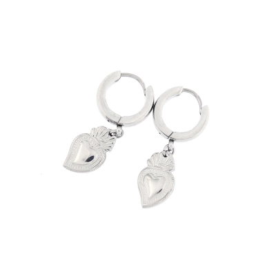 Orecchini a cerchietto navetta, in acciaio di ottima qualità, con cuore votivo pendente. Il cuore votivo, simbolo di ringraziamento per una grazia ricevuta, è oggi diventato anche un oggetto di gran moda per giovani e adulti.