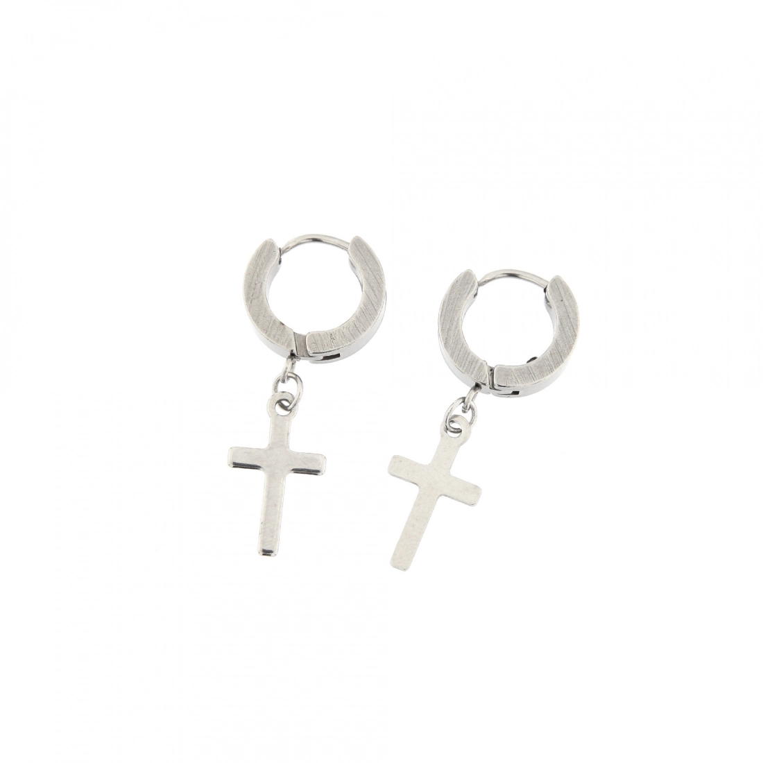Orecchini a cerchietto navetta, in acciaio di ottima qualità, con croce pendente. La croce, simbolo per eccellenza dei cristiani, è oggi diventata anche un oggetto di gran moda per giovani e adulti.