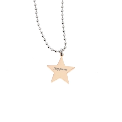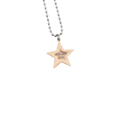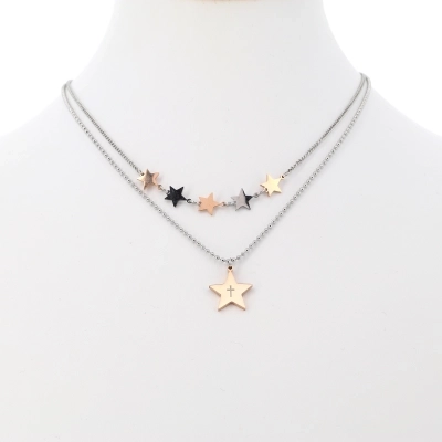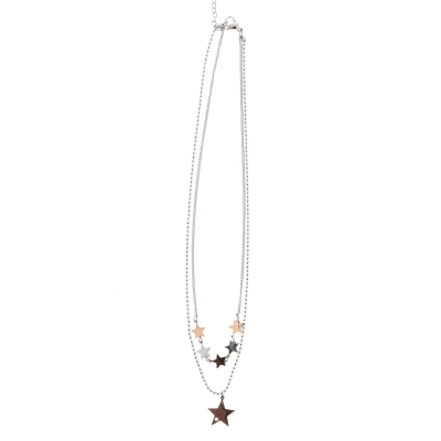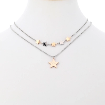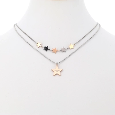 Collana a doppio giro con stelle. Nel primo filo di collana ci sono cinque stelle, due argentate e tre dorate. Nel secondo filo invece c'è una sola stella pendente più grande delle precedenti, sulla quale si può scegliere tra tre proposte di incisioni: una croce stilizzata, la parola "Happiness" e la frase " Abbi cura di te". Sulla stella più grande è incastonato un piccolo strass che rende la collanina ancora più raffinata ed elegante. Prodotto realizzato in acciaio di ottima qualità.