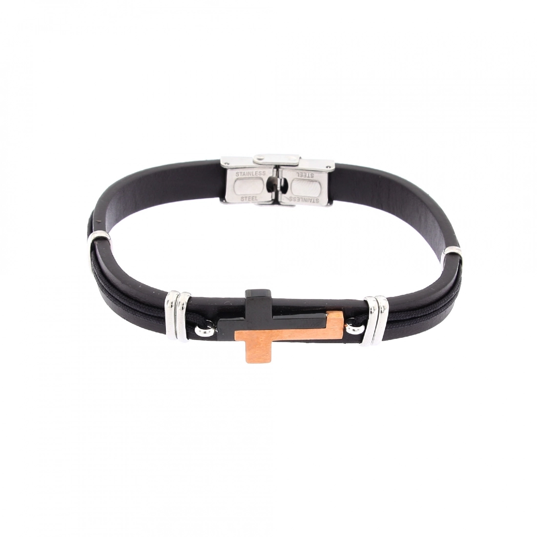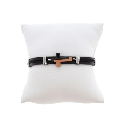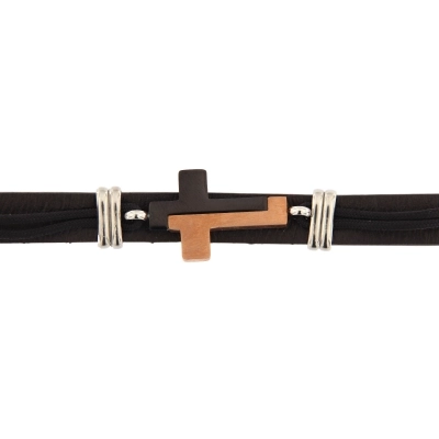 Bracciale da uomo realizzato in pelle nera e al centro una croce in acciaio nera e rosé/bronzata. Il taglio moderno e accattivante rende questo bracciale perfetto per essere regalato in qualsiasi occasione.