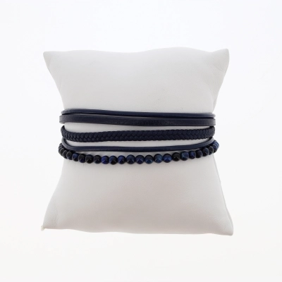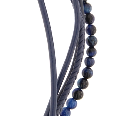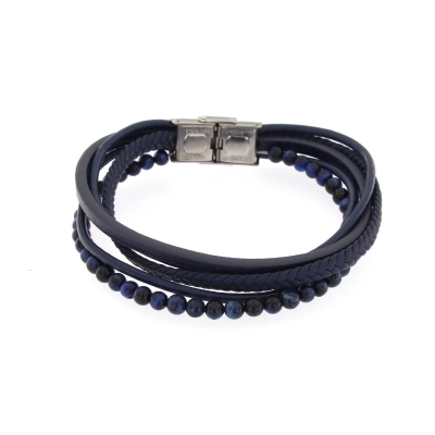 Bracciale da uomo realizzato in pelle a quattro giri di colore blu. Un giro di questo bracciale è interamente realizzato con pietre blu e nere. A chiudere il bracciale una bella fibbia in acciaio. Articolo molto bello e sportivo, ideale da regalarsi e regalare.