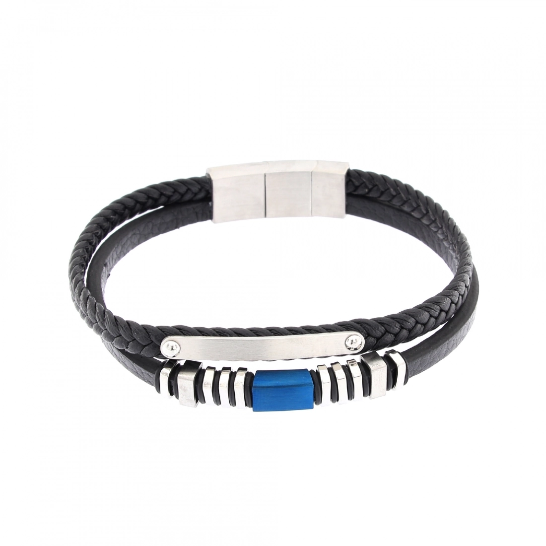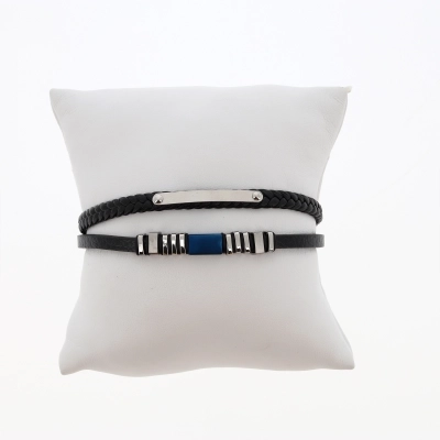 Bracciale da uomo realizzato in pelle a due giri di colore nero. Un giro di questo bracciale è intrecciato e presenta una piastrina in acciaio, invece sull'altro sono presenti elementi in acciaio e acciaio blu. A chiudere il bracciale una bella fibbia in acciaio. La lunghezza del bracciale è di 22 cm, ma può anche essere accorciato di 1,2 cm togliendo una maglia della fibbia. Articolo molto bello e sportivo, ideale da regalarsi e regalare.