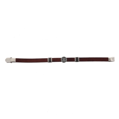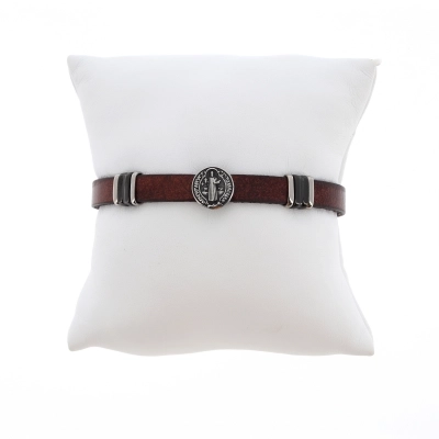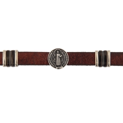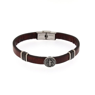 Bracciale in pelle marrone con elementi in acciaio e al centro una medaglia anch'essa in acciaio con la raffigurazione di San Benedetto. Un accessorio bello e significativo da regalarsi e regalare!