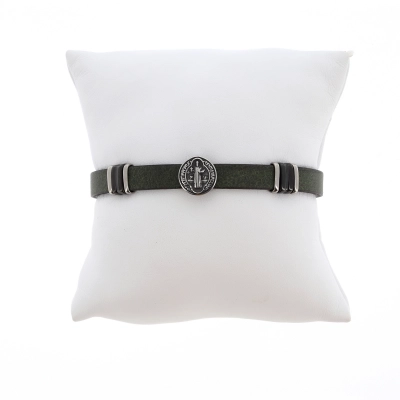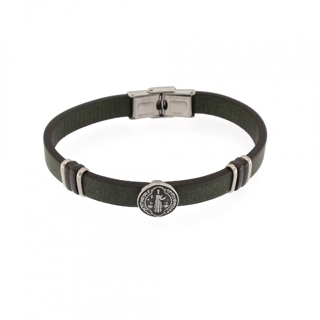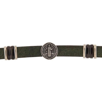 Bracciale in pelle marrone con elementi in acciaio e al centro una medaglia anch'essa in acciaio con la raffigurazione di San Benedetto. Un accessorio bello e significativo da regalarsi e regalare!