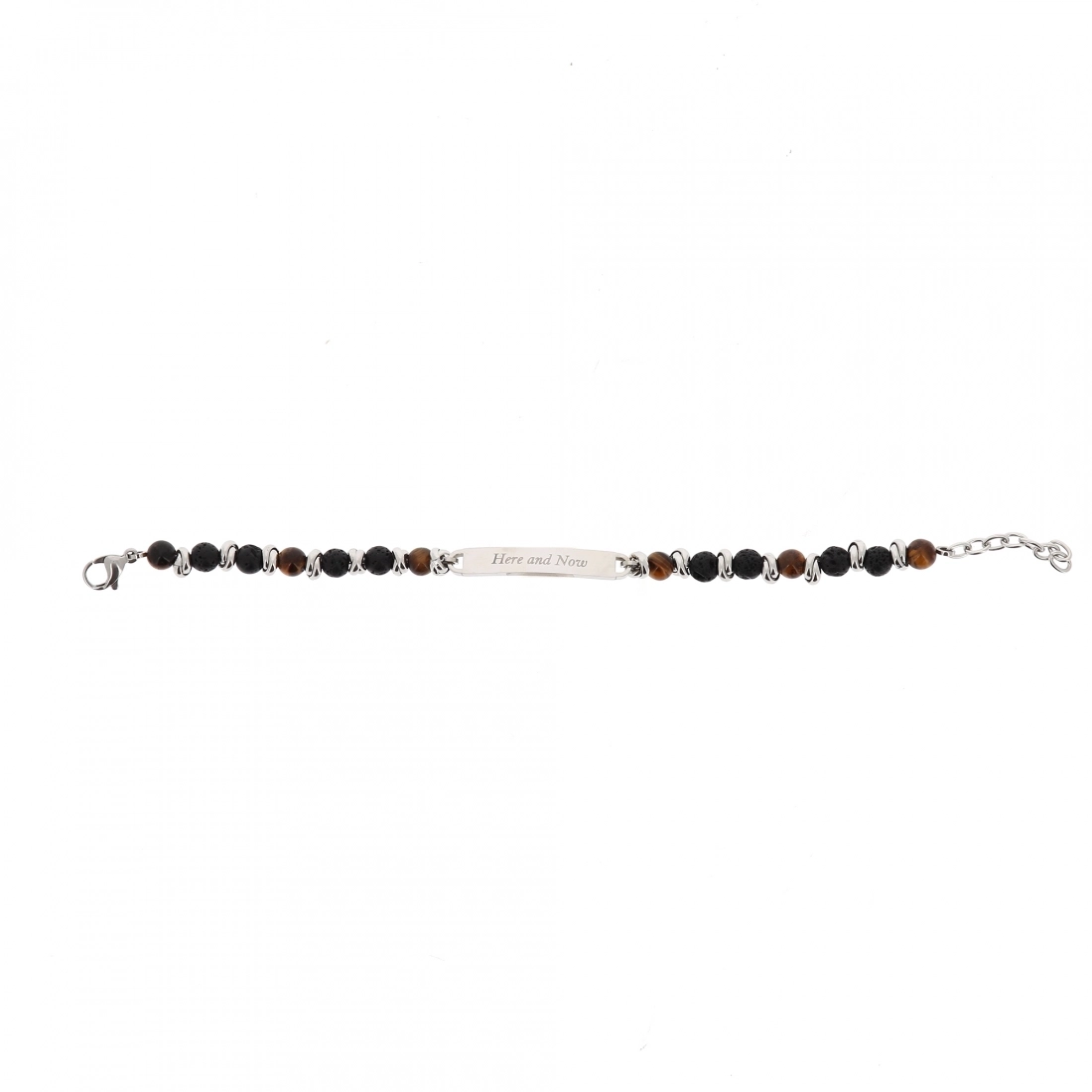 Bracciale da uomo realizzato in acciaio con pietre marroni e nere e placca centrale, sempre in acciaio, su cui è presente l'incisione "Here and Now" (qui e ora). Disponibile anche senza incisione. Bellissimo accessorio da regalarsi e regalare in ogni occasione.