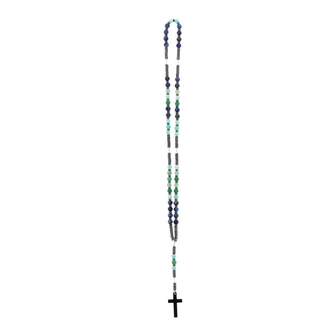Collana rosario indossabile, della lunghezza di 43,5 cm, interamente realizzata con pietre dure, tonde, di colore blu e verde. Bellissimo accessorio da indossare, molto versatile in quanto si adatta a un abbigliamento sia sportivo sia elegante.