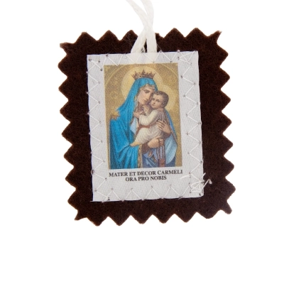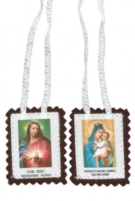Scapolare della Madonna del Carmelo e del Sacro Cuore di Gesù realizzato dalle sapienti mani delle monache Carmelitane. Le immagini a colori, unite da un cordoncino bianco, sono cucite direttamente sull’”abitino” in stoffa marrone. I fedeli portano lo Scapolare del Carmine da oltre sette secoli come protezione di Maria e per ottenere, mediante Sua intercessione, la salvezza eterna e la liberazione dal Purgatorio. La storia infatti narra che il 16 Luglio del 1251, Maria apparve piena di luce a San Simone Stock, generale dell’Ordine Carmelitano, e porgendogli uno scapolare gli disse: “ Prendi figlio dilettissimo, prendi questo scapolare del tuo Ordine, segno distintivo della mia Confraternita, privilegio a te e a tutti i Carmelitani. Chi morirà rivestito di questo abito non soffrirà il fuoco eterno; questo è un segno di salute, di salvezza nei pericoli, di alleanza di pace e di patto sempriterno”.