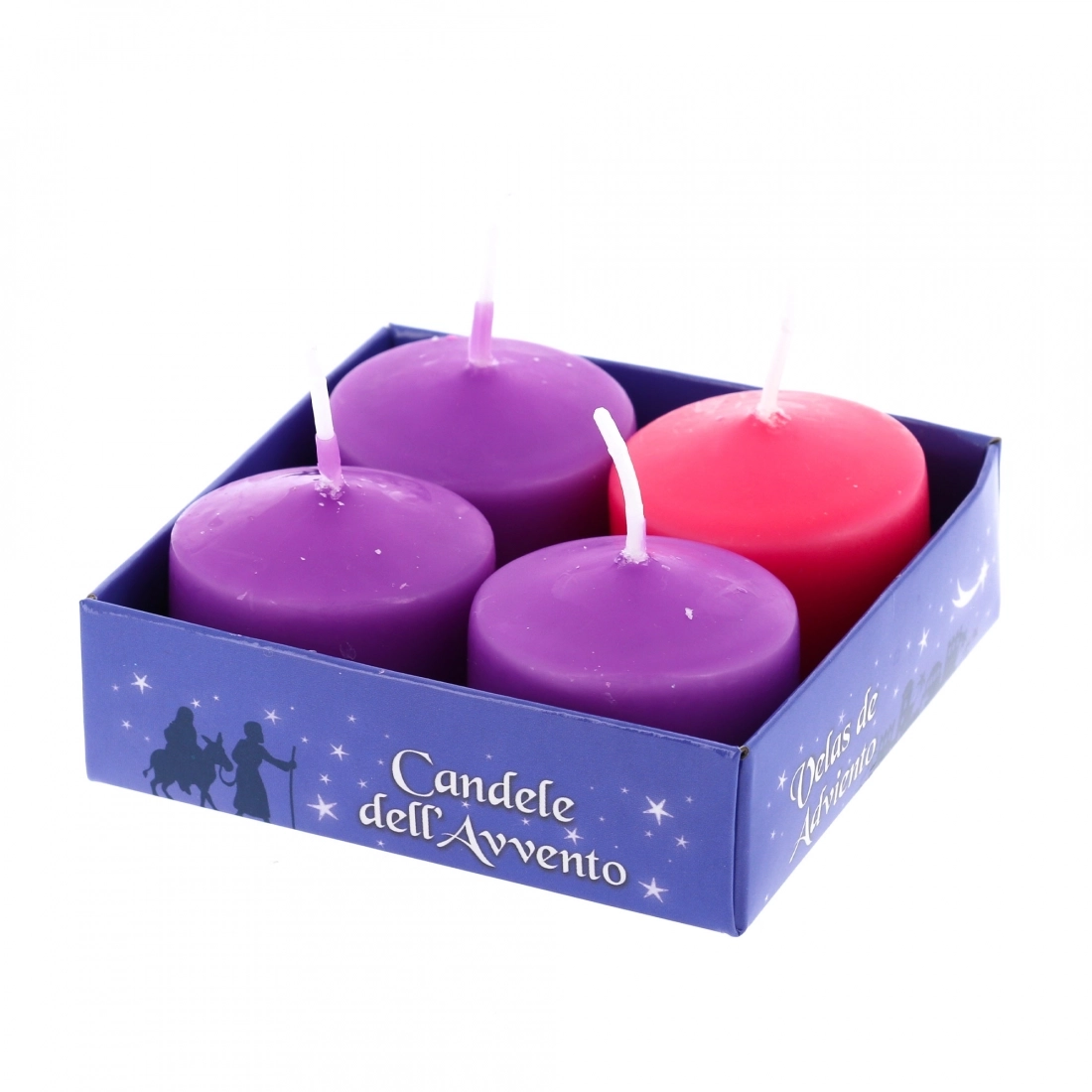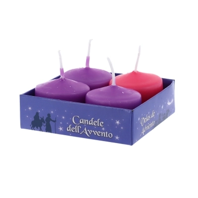 Confezione composta da 4 candele, in cera colorata opaca, di altezza 3 cm e diametro 3,8 cm per la corona d’Avvento. Le candele che compongono il kit sono 3 viola e 1 rosa e vanno accese una per ogni domenica d’Avvento, fino ad arrivare alla domenica di Natale.