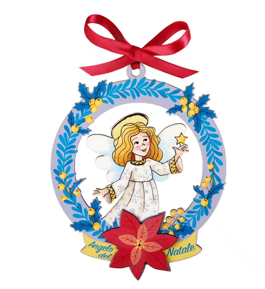 Simpatica ghirlanda in legno, del diametro di 18,5 cm, con nastrino per essere appesa. Vi è raffigurato un carinissimo angioletto! Delizioso addobbo per decorare la casa nel periodo delle festività, può essere usato anche come retroporta.