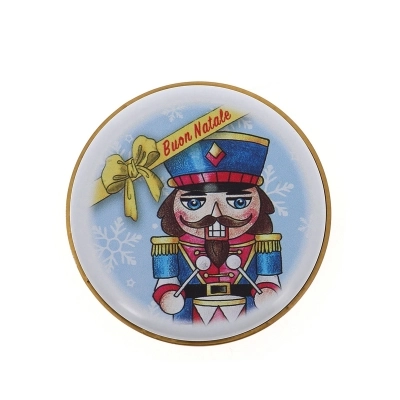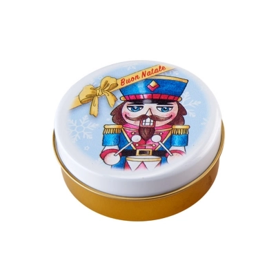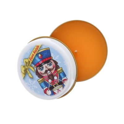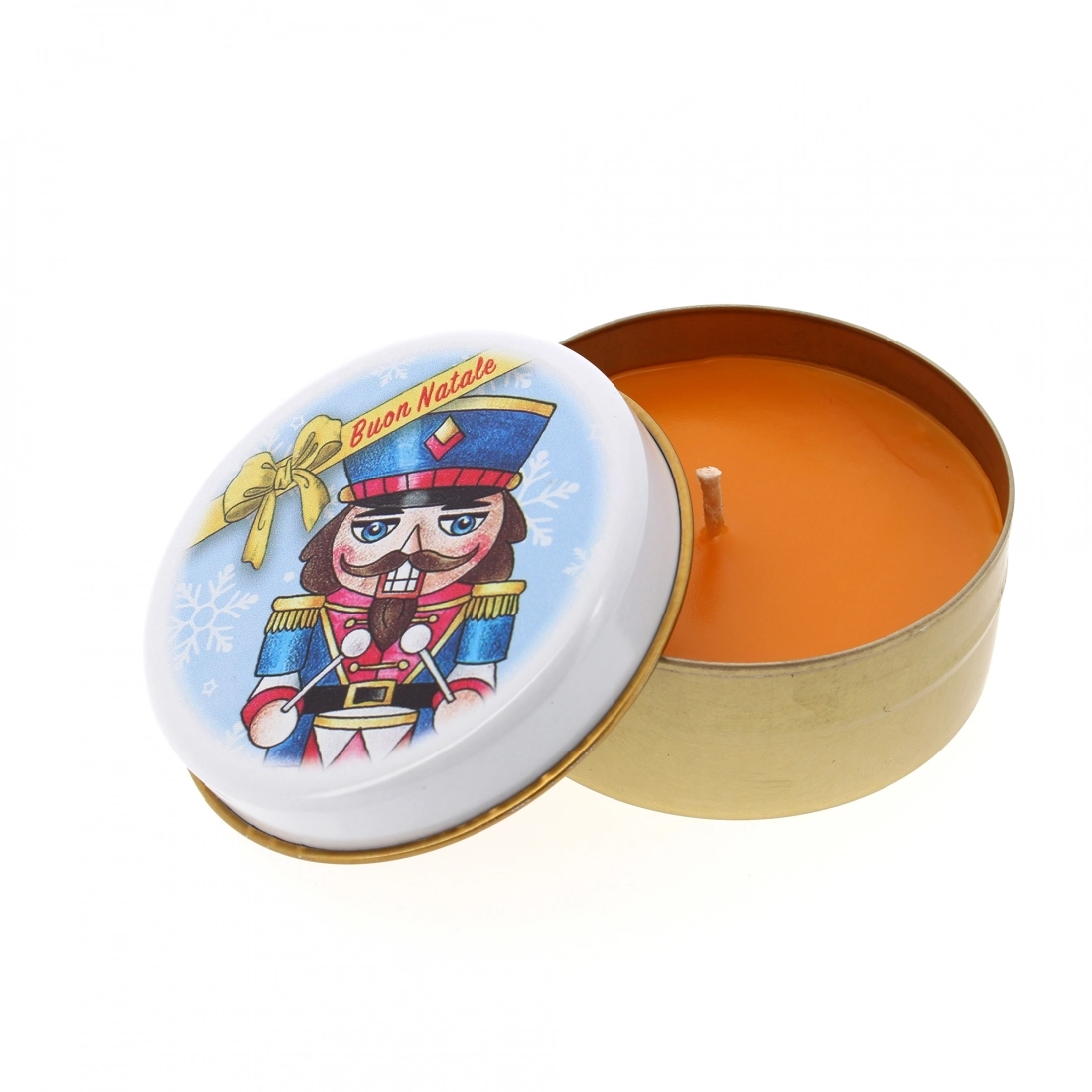 Candela profumata in scatolina di latta del diametro di 7,5 cm. Sul coperchio della scatola è raffigurato lo Schiaccianoci, figura tipica del Natale. Ideale come addobbo in casa o anche come orginale idea regalo. La scatolina può essere riutilizzata, dopo aver rimosso i residui di cera, nel momento in cui tutta la candela si consuma.
