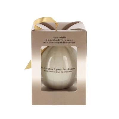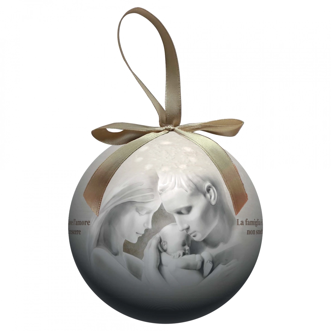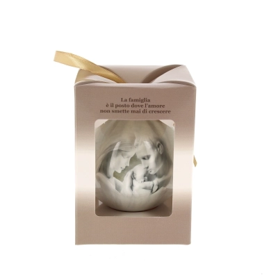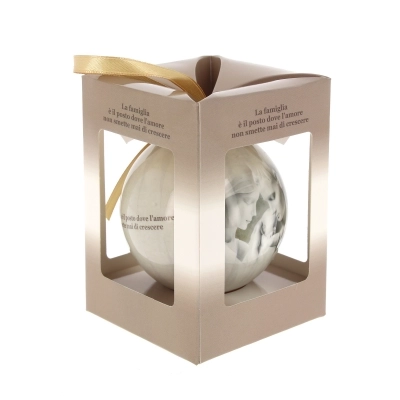 Pallina natalizia (del diametro di 7,5 cm) inserita all'interno di una bella confezione in cartoncino (dalle misure 10,5x8 cm) che la rende adatta per essere regalata. Sulla pallina è presente la rappresentazione della Santa Famiglia e la frase: "La famiglia è il posto dove l'amore non smette mai di crescere". Bellissimo articolo da acquistare per sé stessi, per arricchire il proprio albero di natale con oggetti sacri o da regalare a qualcuno di speciale per augurargli un sereno Natale da trascorrere insieme alla cosa più preziosa: la famiglia.