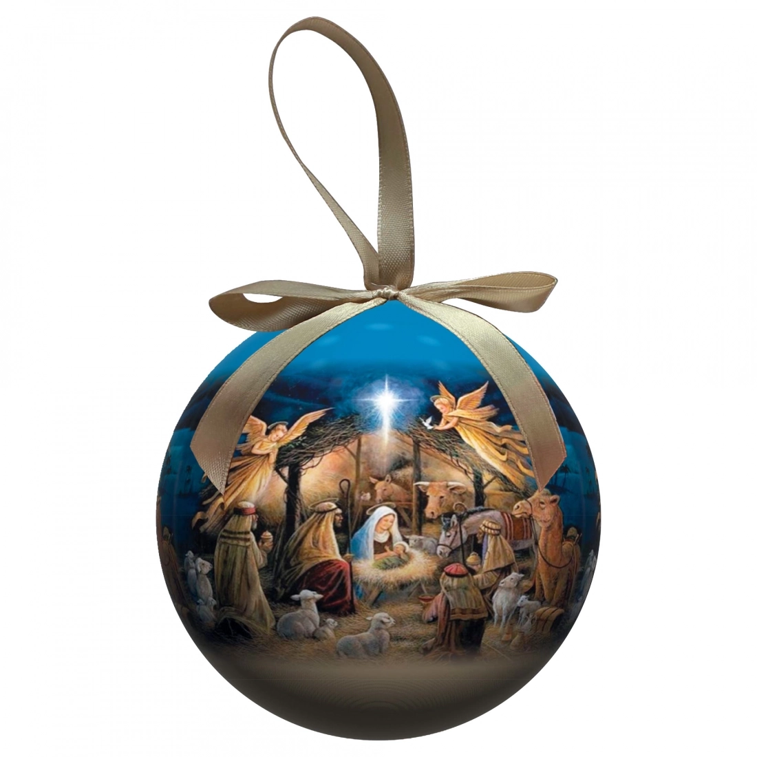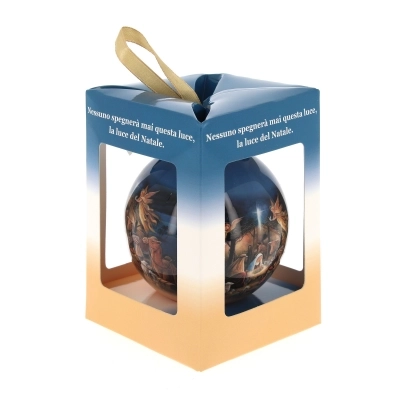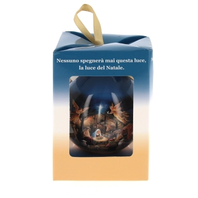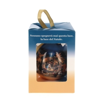 Pallina natalizia (del diametro di 7,5 cm) inserita all'interno di una bella confezione in cartoncino che la rende adatta per essere regalata. Sulla pallina è presente la rappresentazione della Natività e sulla confezione la frase: "Nessuno spegnerà mai questa luce, la luce del Natale". Bellissimo articolo dai colori vivaci, da acquistare per sé stessi o da regalare a qualcuno di speciale per augurargli un sereno Natale.