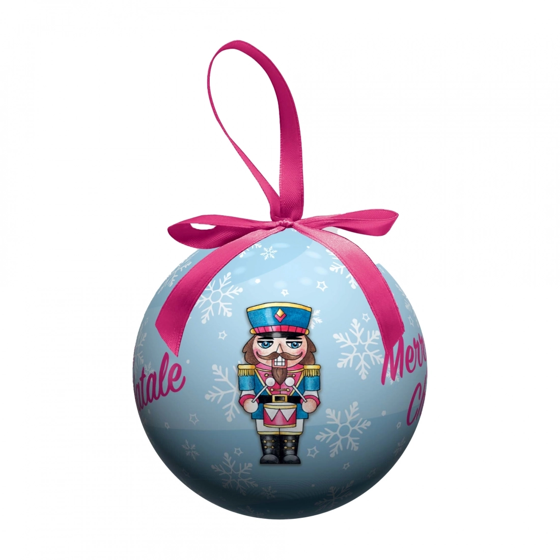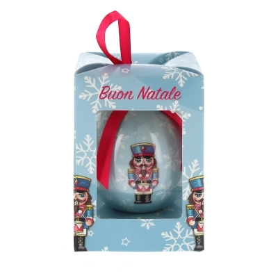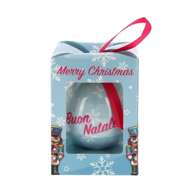 Simpatica pallina natalizia (del diametro di 7,5 cm) inserita all'interno di una bella confezione in cartoncino che la rende adatta per essere regalata. Sulla pallina è disegnato un simpatico Schiaccianoci e sulla confezione l'augurio di un buon Natale (Merry Christmas). Bellissimo articolo dai colori vivaci, da acquistare per sé stessi o da regalare a qualcuno di speciale per augurargli un sereno Natale.