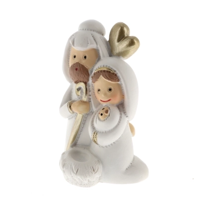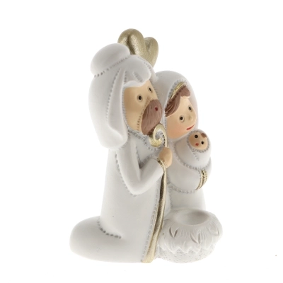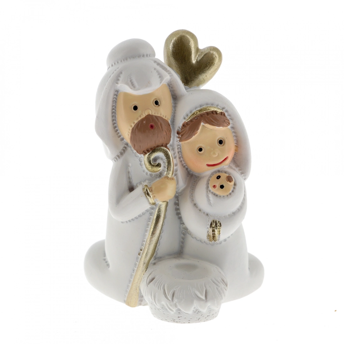 Simpatica raffigurazione della natività (dell'altezza di 5,7 cm) in resina bianca e dettagli oro, con cuore dorato in resina. Perfetto come addobbo natalizio da regalare o regalarsi.