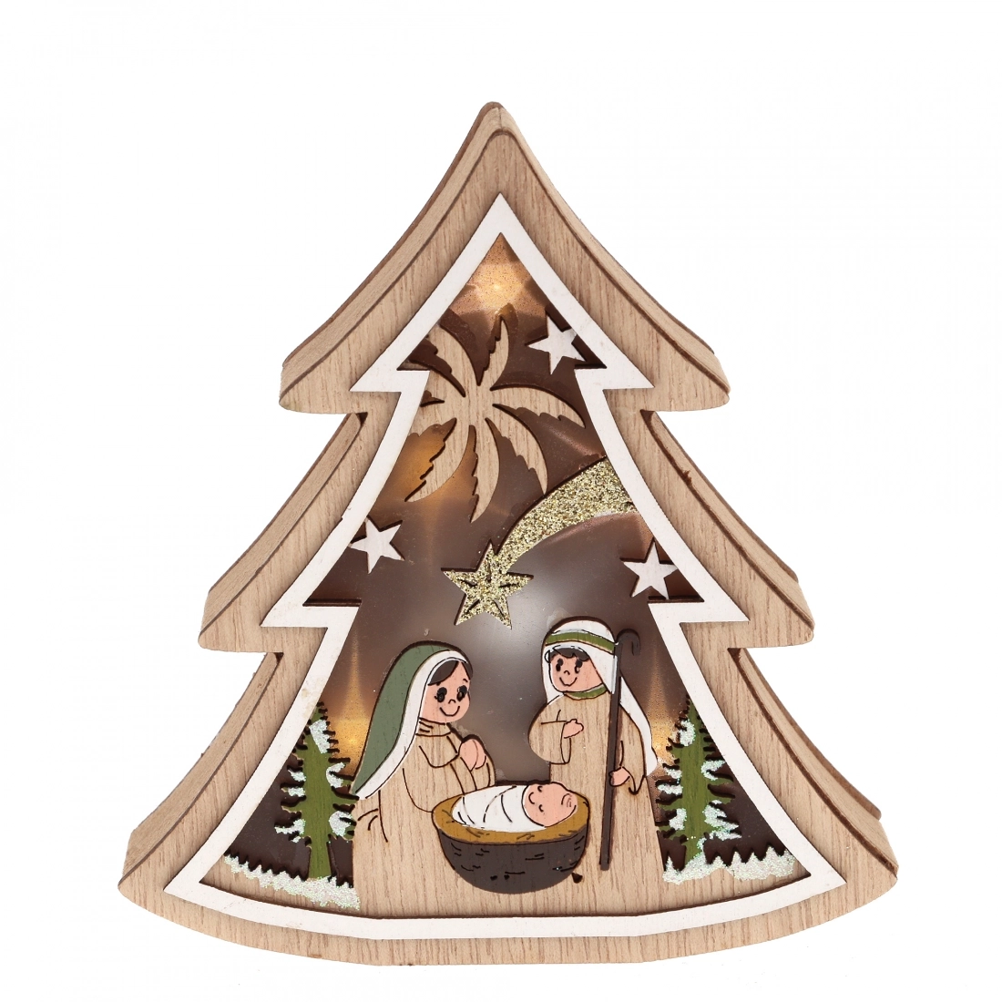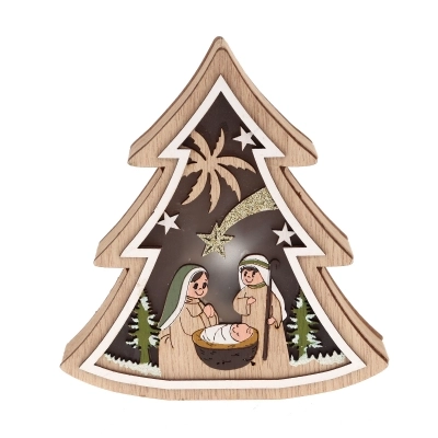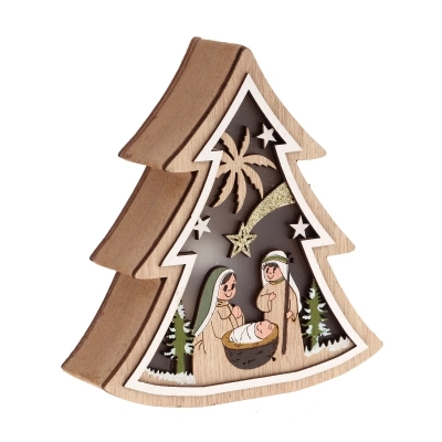 Presepe da appoggio realizzato in legno, delle dimensioni di h.13,5 x l. 12,5 cm. È una struttura in legno a forma di albero di Natale, all'interno della quale troviamo la Madonna e san Giuseppe che guardano il loro bambino Gesù, mentre una stella cometa li protegge dall'alto. All'interno della struttura in legno è presente un led che permette di illuminare questo carinissimo e originale presepe. Ideale come decorazione natalizia da regalare o regalarsi.