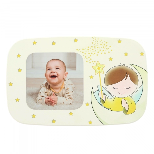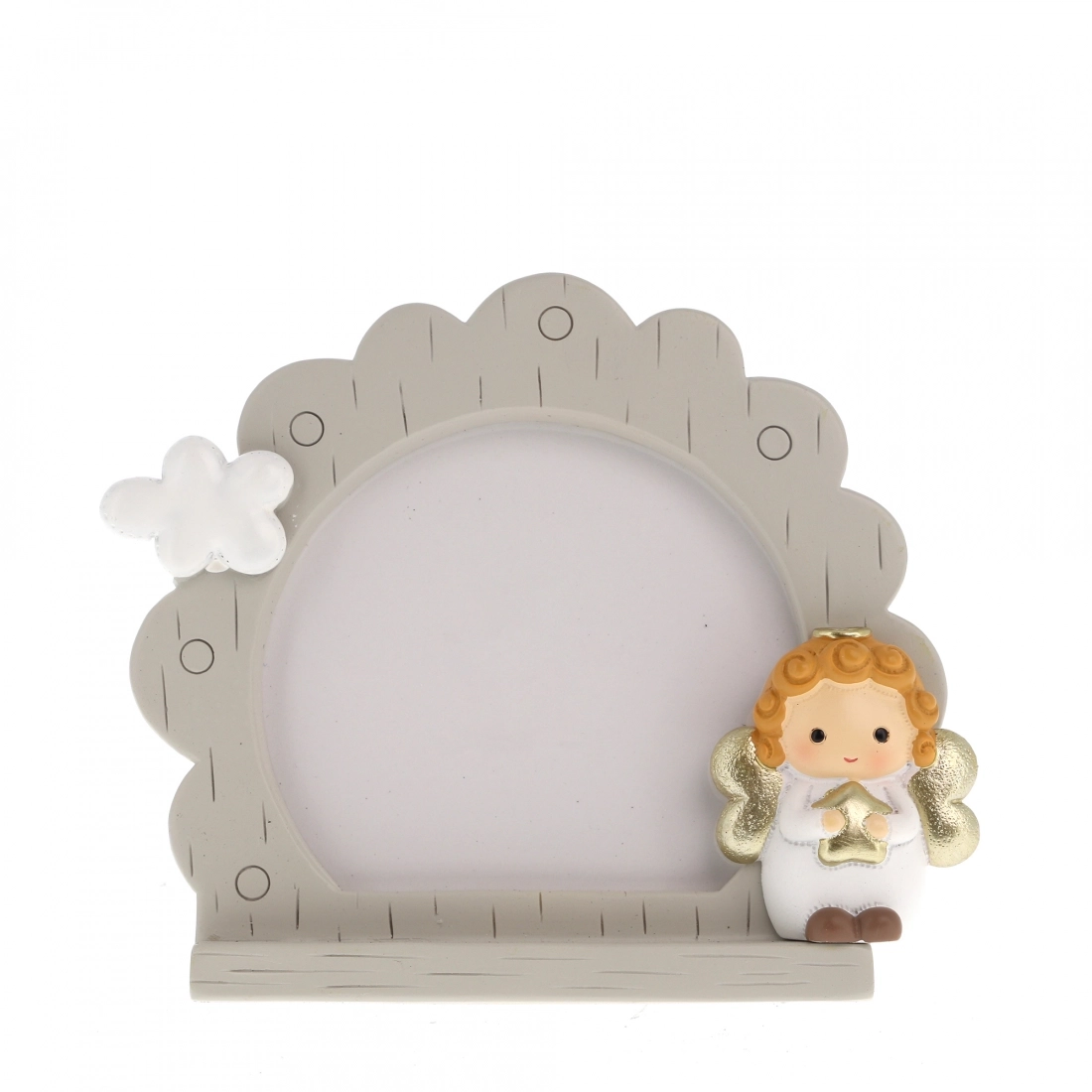 Carinissima cornice portafoto in resina colorata delle dimensioni 11,2x13 cm. È a forma di nuvoletta e sul lato in basso troviamo un angioletto applicato, in resina, paffuto e sorridente, che regge una stella dorata. Il formato della foto adatto al porta foto è 9x8 cm. Bel pensierino di Natale, per un bimbo o una bimba, da tenere in cameretta.