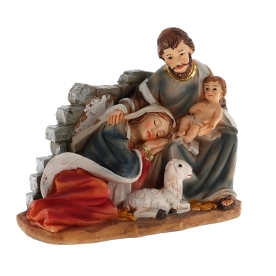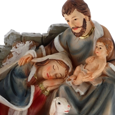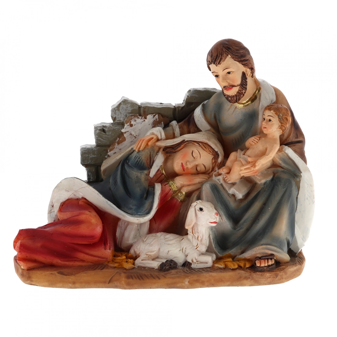 Dolcissima statuetta che rappresenta la Natività, realizzata in resina colorata, dell'altezzza di 8,8 cm. Viene rappresentata la Madonna, nell'atto di riposarsi, appoggiata dolcemente su san Giuseppe che tiene in braccio Gesù Bambino e veglia amorevole sulla sua famiglia.