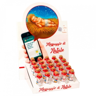 Bottiglietta in vetro con tappo in sughero. All’interno contiene un biglietto con frasi sul Natale. La bottiglietta è corredata da un ciondolo con la Stella di Betlemme e un cordoncino rosso. Una bellissima idea regalo per il Santo Natale!