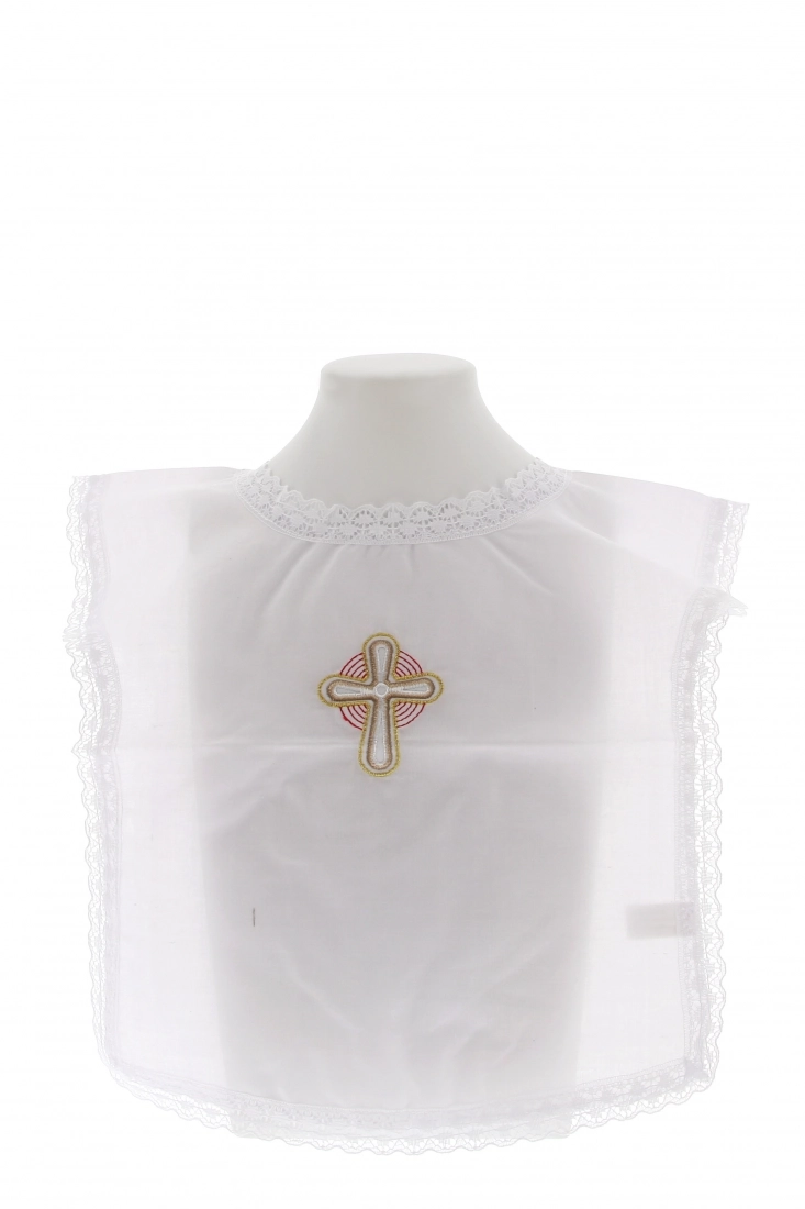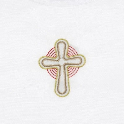Vestina per Battesimo bianca, 65% poliestere e 35% cotone, con merletto laterale. Si indossa molto facilmente come una tunica, inserendola dalla testa del bambino. Al centro della vestina c'è un ricamo colorato che raffigura una croce e significa che è Cristo ad averli chiamati ed accolti come persona nel cammino di fede.