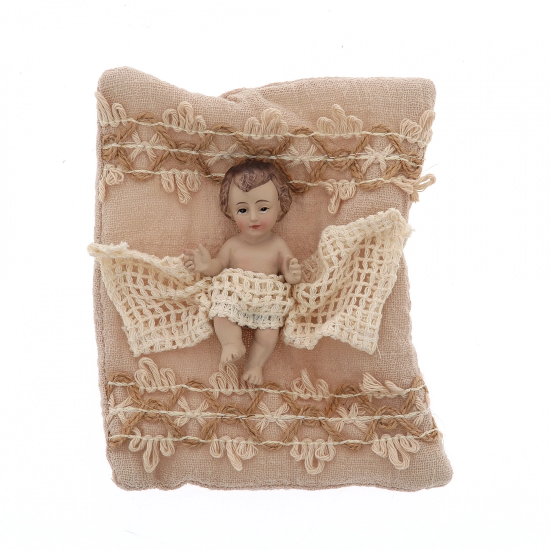 Statuetta di Gesù Bambino su cusino in stoffa. Il Bambinello, delle dimensioni di 10,5 cm. è realizzato in resina. Il cuscino è ricco di dettagli ben rifiniti e curato nei particolari,ideale per essere esposta in qualsiasi ambiente domestico. Adatta come idea regalo da donare in qualsiasi momento e per qualsiasi occasione, ma si arricchisce di valore spirituale soprattutto se regalata nel periodo natalizio.