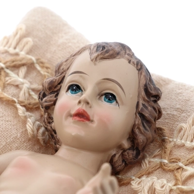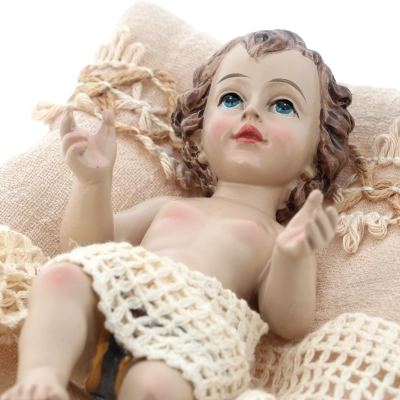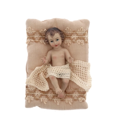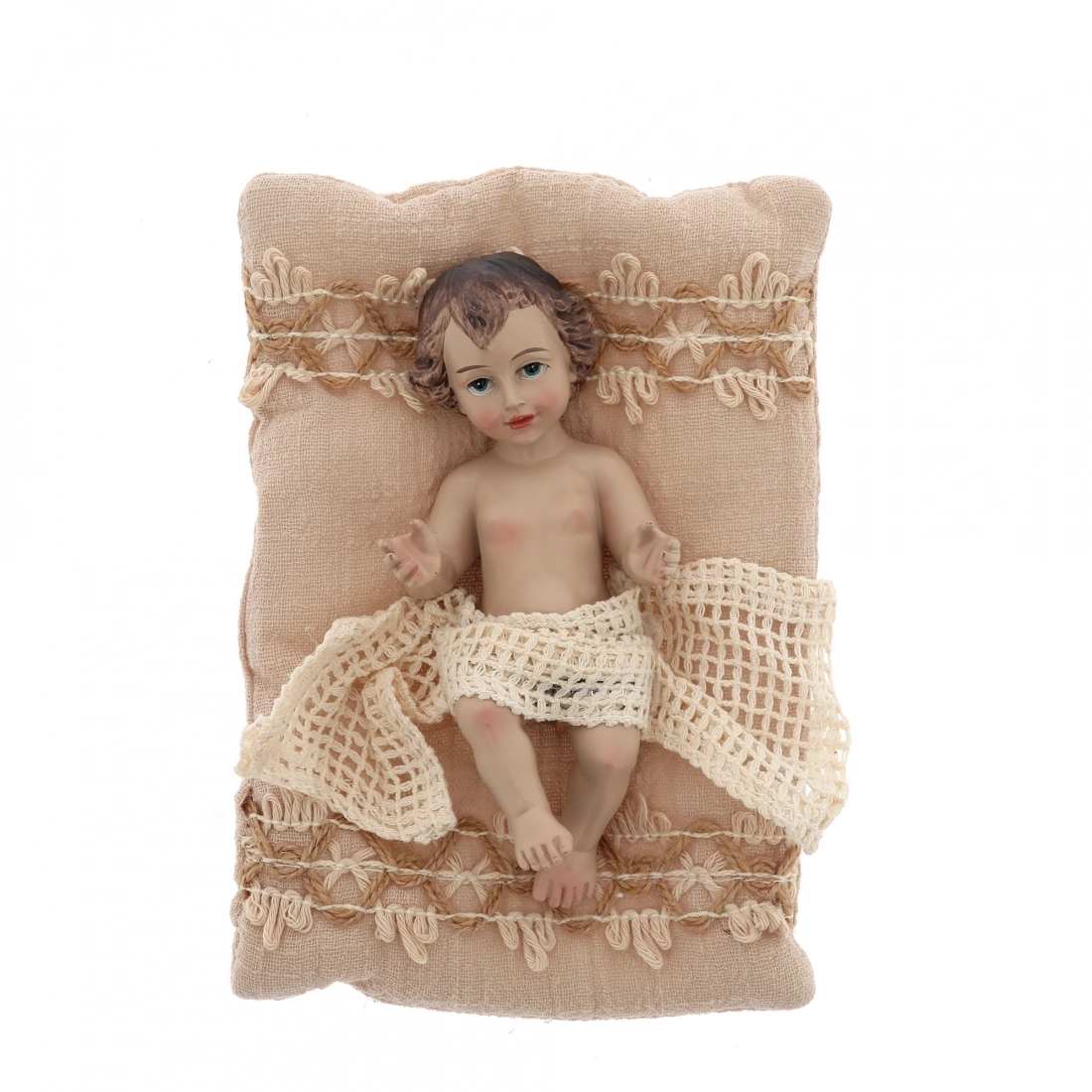 Statuetta di Gesù Bambino su cusino in stoffa. Il Bambinello, delle dimensioni di 14,7 cm. è realizzato in resina. Il cuscino è ricco di dettagli ben rifiniti e curato nei particolari,ideale per essere esposta in qualsiasi ambiente domestico. Adatta come idea regalo da donare in qualsiasi momento e per qualsiasi occasione, ma si arricchisce di valore spirituale soprattutto se regalata nel periodo natalizio.