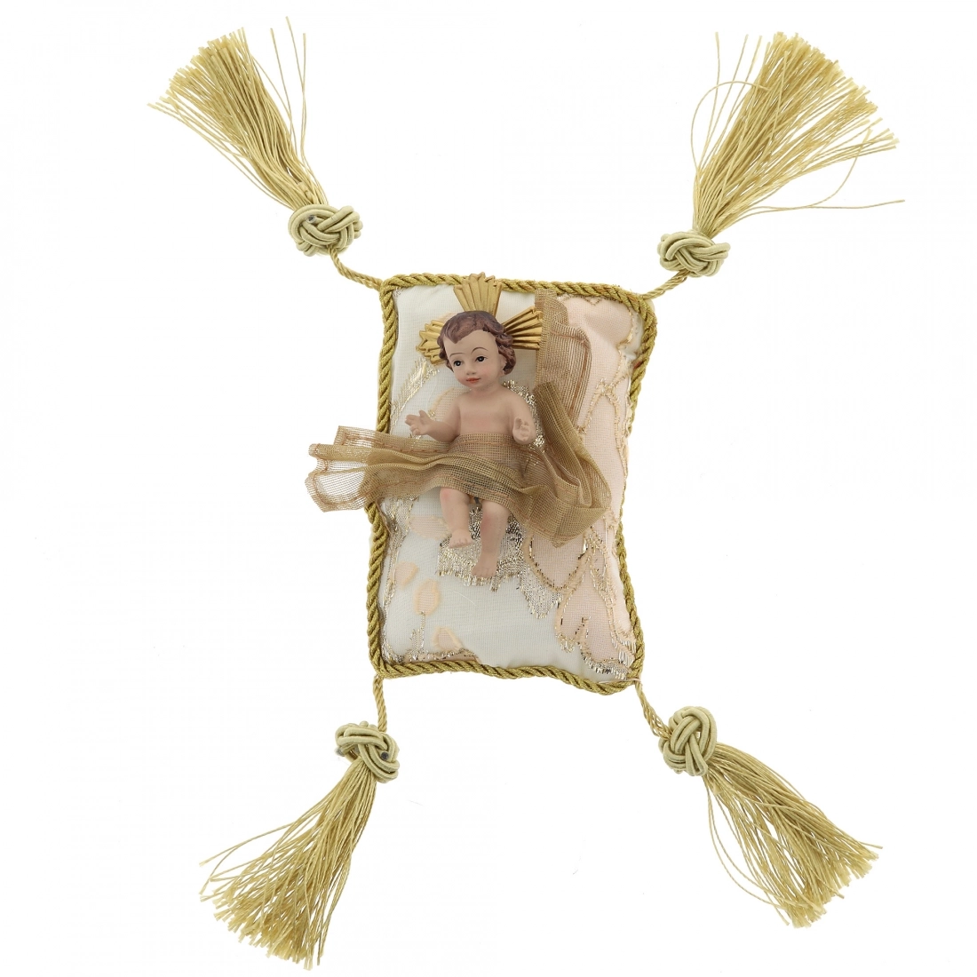 Statuetta di Gesù Bambino su cusino in stoffa. Il Bambinello, già completo anche di aureola, ha dimensioni di 8,5 cm. ed è realizzato in resina. Il cuscino è ricco di dettagli ben rifiniti e curato nei particolari,ideale per essere esposta in qualsiasi ambiente domestico. Adatta come idea regalo da donare in qualsiasi momento e per qualsiasi occasione, ma si arricchisce di valore spirituale soprattutto se regalata nel periodo natalizio.