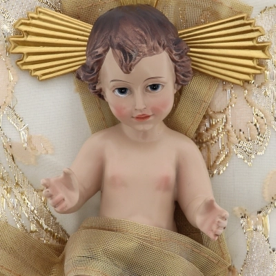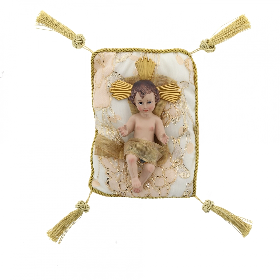 Statuetta di Gesù Bambino su cusino in stoffa. Il Bambinello, già completo anche di aureola, ha dimensioni di 17,5 cm. ed è realizzato in resina. Il cuscino è ricco di dettagli ben rifiniti e curato nei particolari,ideale per essere esposta in qualsiasi ambiente domestico. Adatta come idea regalo da donare in qualsiasi momento e per qualsiasi occasione, ma si arricchisce di valore spirituale soprattutto se regalata nel periodo natalizio.