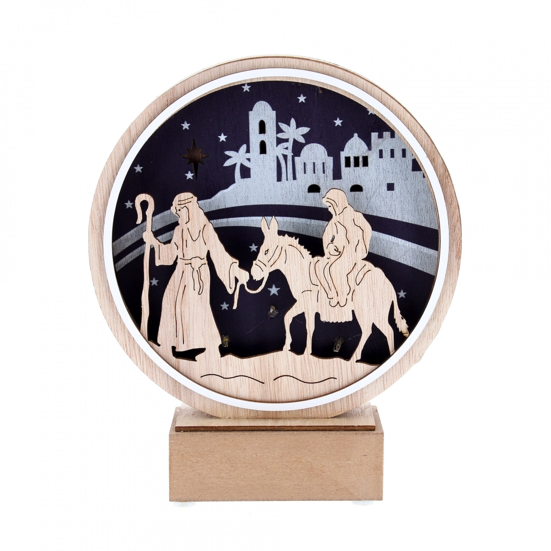 Bellissima rappresentazione in legno di Giuseppe e Maria che si dirigono a fare il censimento poco prima la nascita di Gesù. La rappresentazione è in legno ed è posta in rilievo su un cerchio con sfondo decorato, dotato anche di luce interna che è possibile accendere e spegnere grazie al bottoncino posto sotto. Quando acceso crea una bellissima atmosfera natalizia. Funziona con due batterie AAA (non in dotazione). Addobbo natalizio da tenere in qualsiasi ambiente domestico, come ornamento per le festività. Ideale anche come idea regalo.