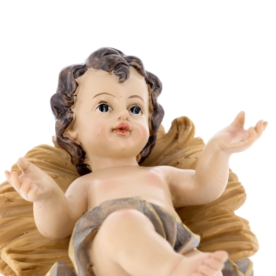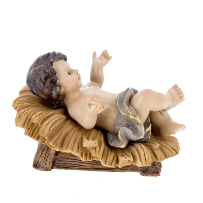 Statua di Gesù Bambino, dall'altezza di 16 cm, raffigurato con un lenzuolino e posto sulla mangiatoia, compresa nel prodotto. Ideale da donare durante le festività natalizie, come regalo di grandissimo valore spirituale.