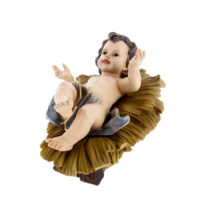 Statua di Gesù Bambino, dall'altezza di 26 cm, raffigurato con un lenzuolino e posto sulla mangiatoia, compresa nel prodotto. Ideale da donare durante le festività natalizie, come regalo di grandissimo valore spirituale.