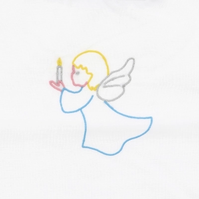 Vestina per Battesimo bianca, 65% poliestere e 35% cotone, con merletto laterale. Si indossa molto facilmente come una tunica, inserendola dalla testa del bambino. Al centro della vestina c'è un ricamo colorato che raffigura un angelo, segno della provvidenza di Dio, che con la loro protezione e intercessione, circondano tutta la vita umana del fedele.