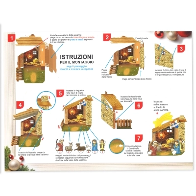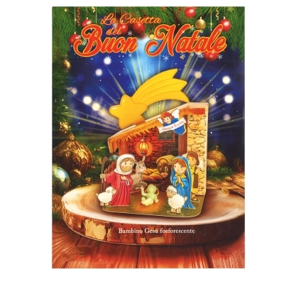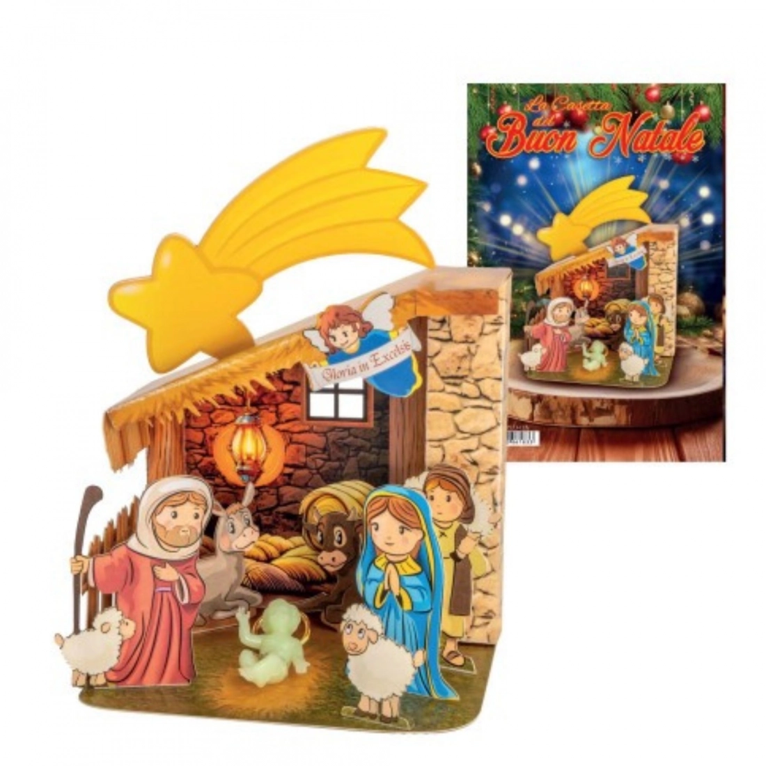 Simpatica capanna con presepe tridimensionale in cartoncino, da montare. Tutti i personaggi del presepe sono in cartoncino, tranne il Bambinello che è realizzato in plastica fosforescente.