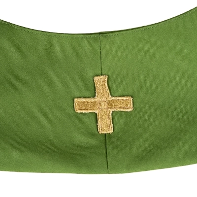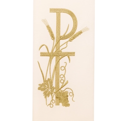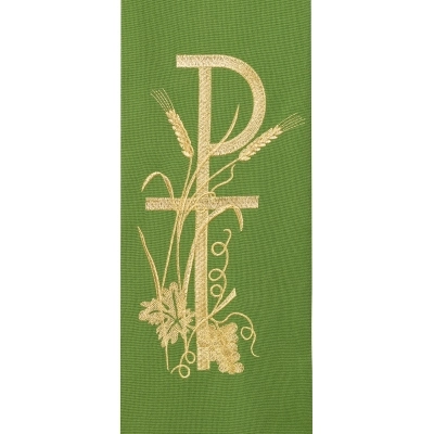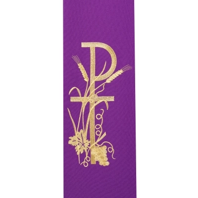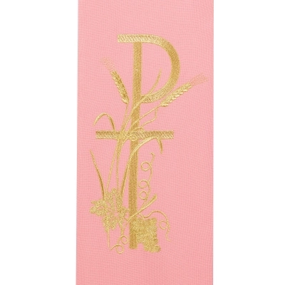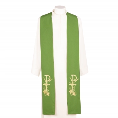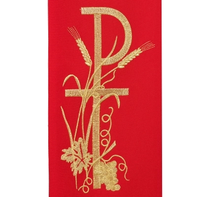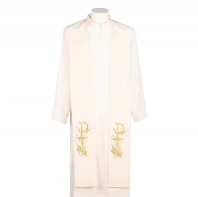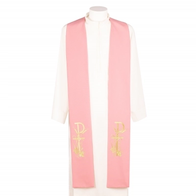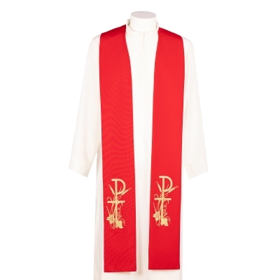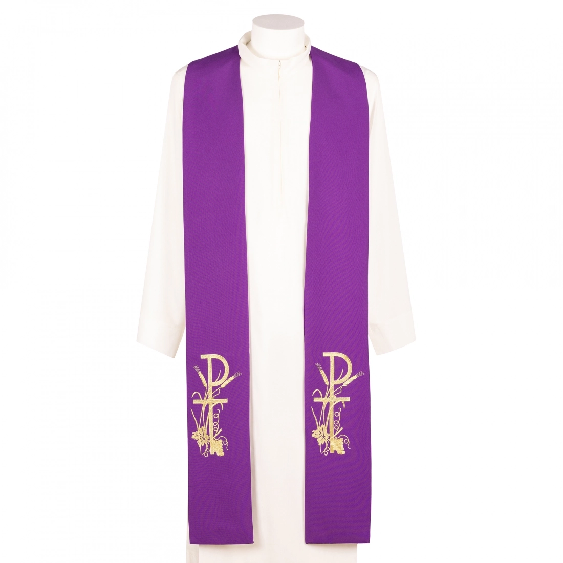 Stola con bellissimo ricamo dorato raffigurante il simbolo Pax e croce. Realizzata in tessuto 100% poliestere. Disponibile nei vari colori liturgici: avorio, rosso, verde, rosa e viola. La lunghezza complessiva della stola è di 256 cm e quando indossata arriva ben oltre il ginocchio.