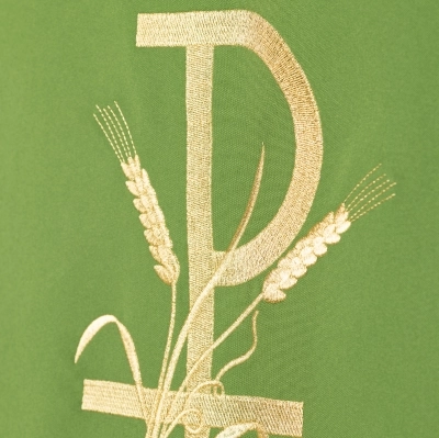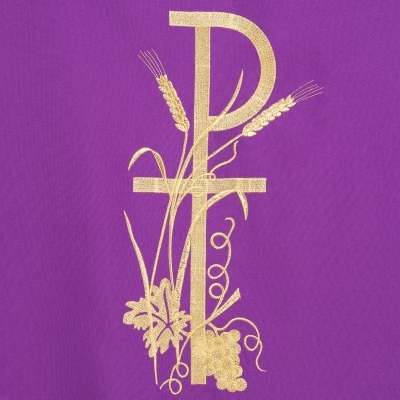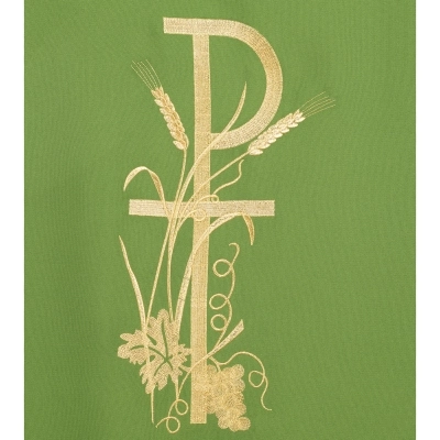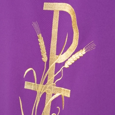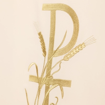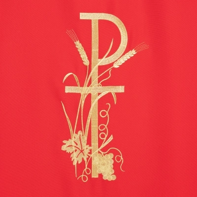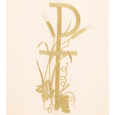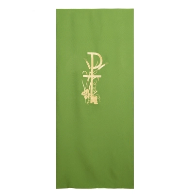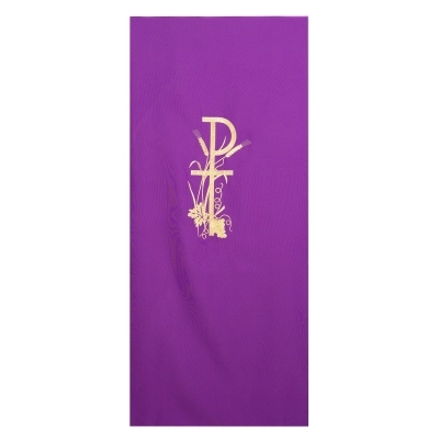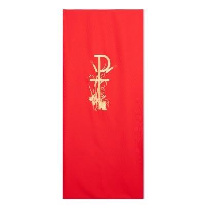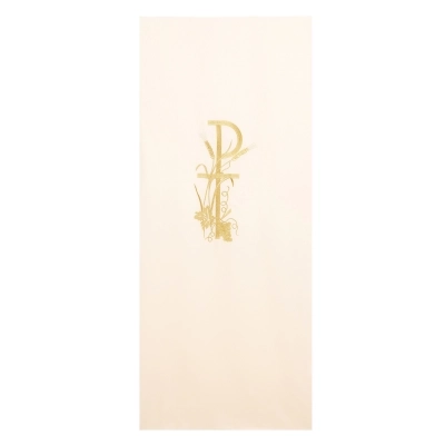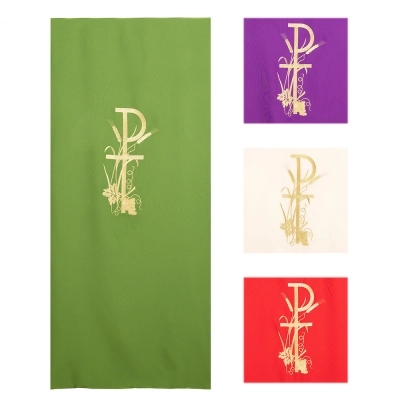 Copri ambone delle dimensioni 55x250 cm con bellissimo ricamo dorato raffigurante il simbolo Pax e croce. Realizzata in tessuto 100% poliestere. Disponibile nei vari colori liturgici: avorio, rosso, verde e viola.