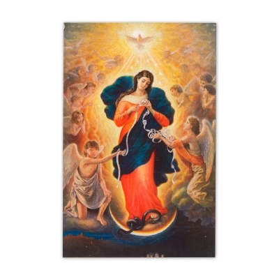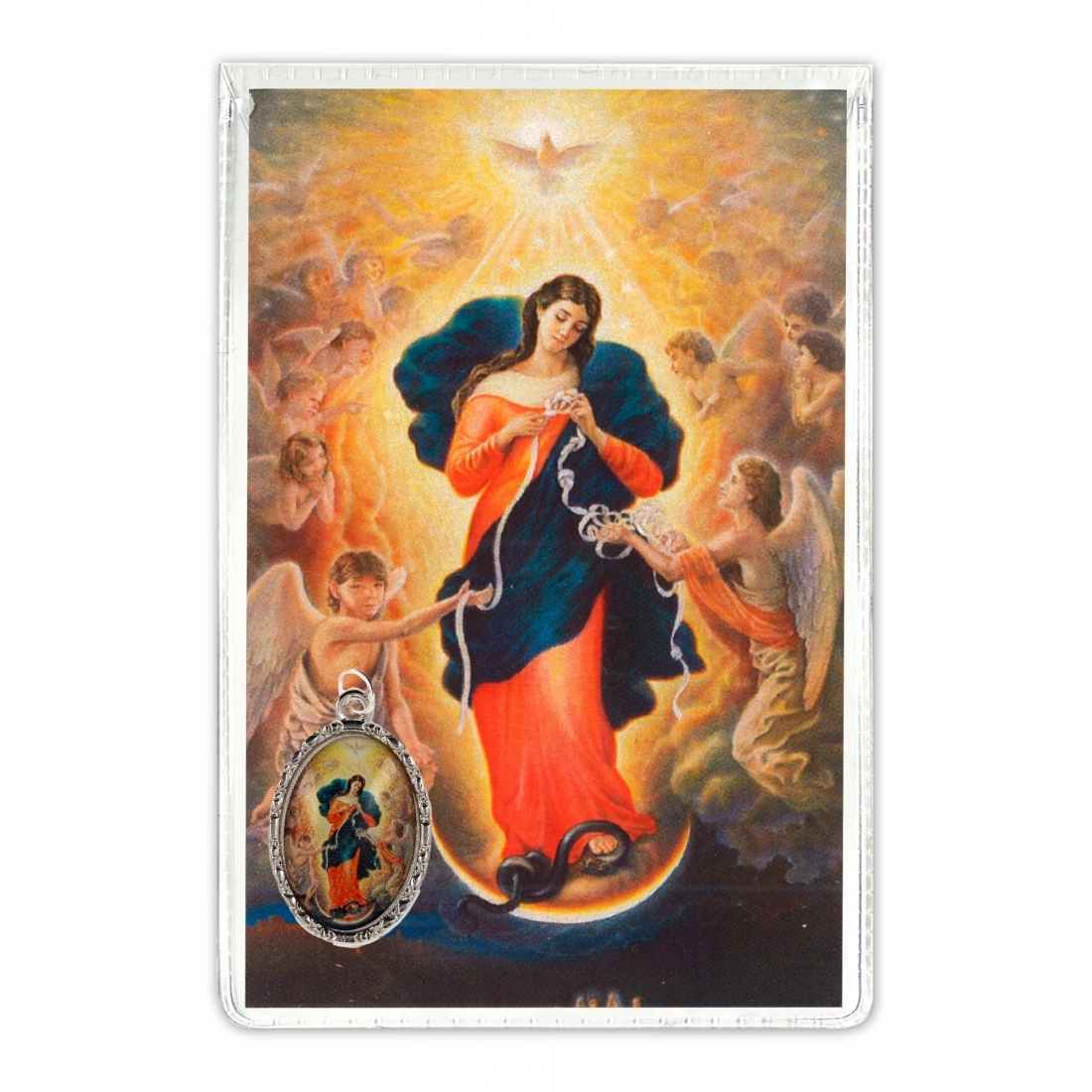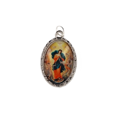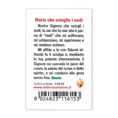 Medaglia smaltata di Maria che scioglie i nodi con anellino che consente di appenderla a una collana e indossarla (collanina non inclusa). La medaglia, dalle dimensioni di 2x1,5 cm, è contenuta in una confezione in plastica trasparente (7x5 cm), all'interno della quale troviamo una bella immagine di Maria che scioglie i nodi da un lato e dall'altro una preghiera a lei dedicata. Ideale da portare sempre con sé, anche nel portafoglio, come protezione. La medaglia ha dimensioni 2x1,5 cm
