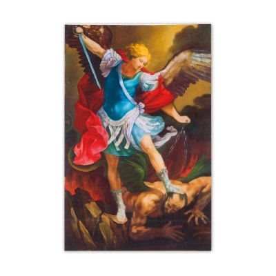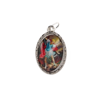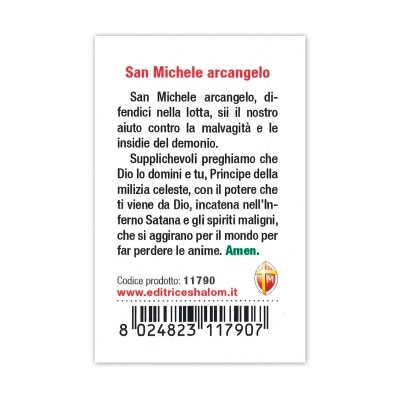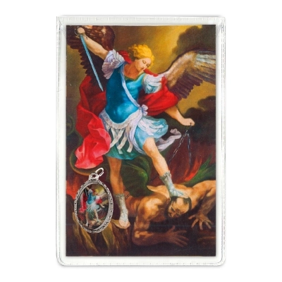 Medaglia smaltata di san Michele arcangelo con occhiello che consente di appenderla a una collana e indossarla (collanina non inclusa). La medaglia è contenuta in una confezione in plastica trasparente (delle dimensioni di 7x5 cm), all'interno della quale troviamo una bella immagine di san Michele da un lato e dall'altro una preghiera a lui dedicata. Ideale da portare sempre con sé, anche nel portafoglio, come protezione. La medaglia ha dimensioni 2x1,5 cm