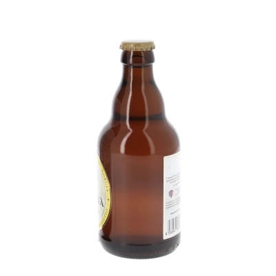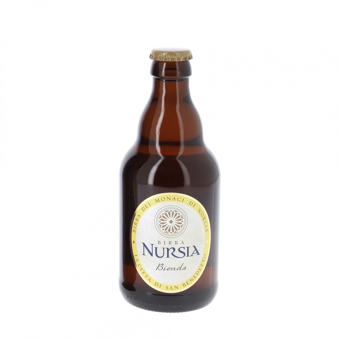 Birra Nursia Bionda, bottiglia da 330 ml. La birra Nursia è la birra prodotta dai monaci birrai benedettini di Norcia che, con i ricavi ottenuti dalla vendita della birra, cercano di essere autosufficienti nella costruzione della loro nuova casa e di aiutare le persone della zona colpite dal grande terremoto del 2016.