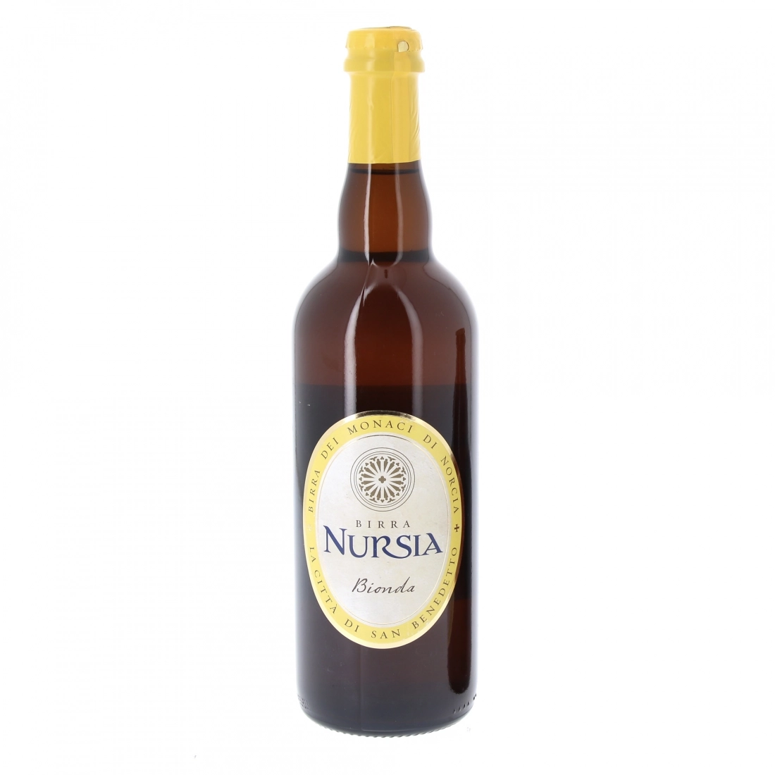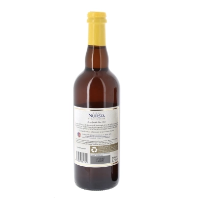Birra Nursia Bionda, bottiglia da 750 ml. La birra Nursia è la birra prodotta dai monaci birrai benedettini di Norcia che, con i ricavi ottenuti dalla vendita della birra, cercano di essere autosufficienti nella costruzione della loro nuova casa e di aiutare le persone della zona colpite dal grande terremoto del 2016.