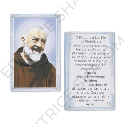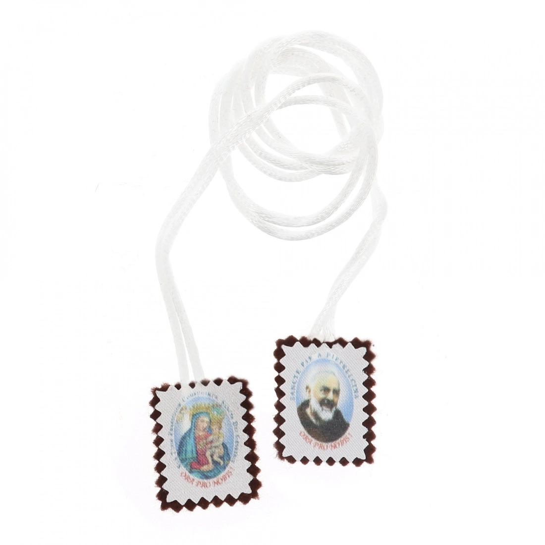 Scapolare in stoffa (delle dimensioni di 3x2,5 cm) dedicato a san Pio. Nella confezione è presente anche un bigliettino con immagine e preghiera rivolta al Santo.