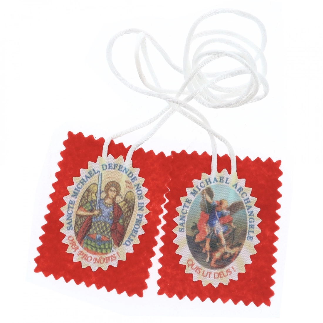 Scapolare in stoffa (delle dimensioni di 7x5,5 cm) dedicato a san Michele arcangelo. Nella confezione è presente anche un bigliettino con immagine e preghiera rivolta all'arcangelo.