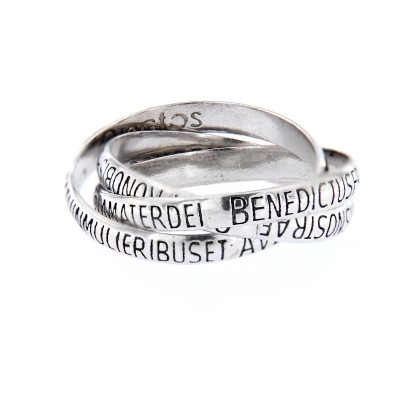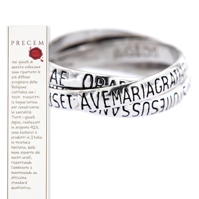 Anello in argento con lavorazione rodio brunito 925, composto da un trio di anelli intrecciati sui quali è incisa, in latino, l'Ave Maria " Ave maria, gratia plena, dominus tecum, benedicta tu in mulieribus et benedictus fructus ventris tui, jesus. sancta maria, mater dei, ora pro nobis peccatoribus, nunc et in hora mortis nostrae".