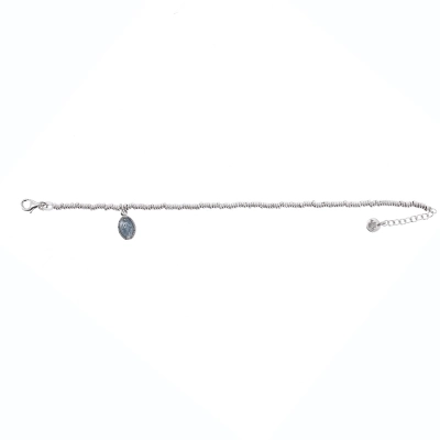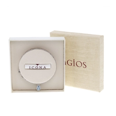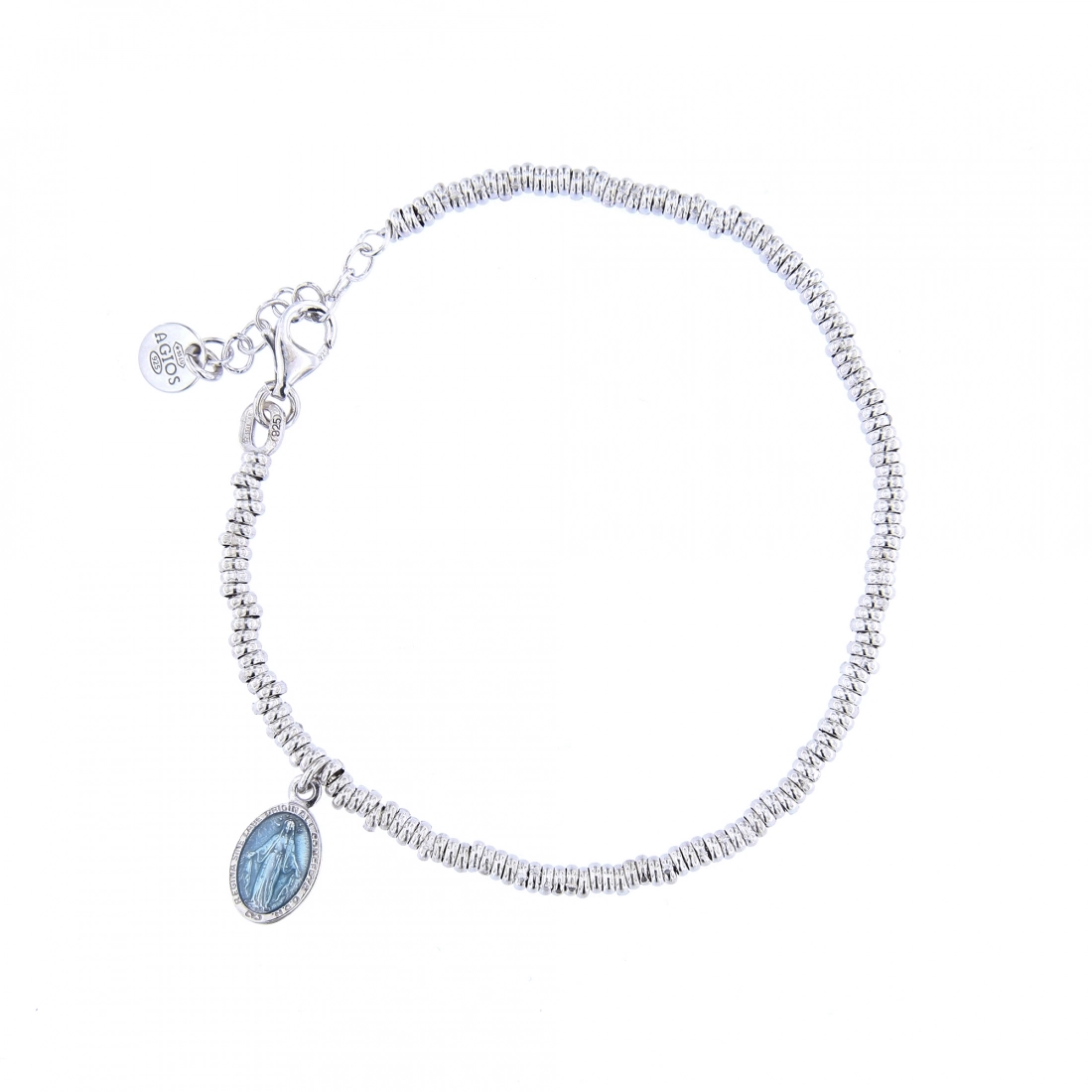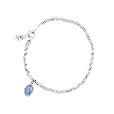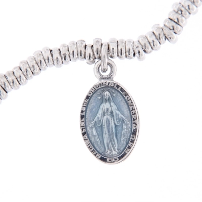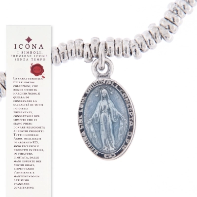 Bracciale Mater C in argento 925 rodiato, dalla lunghezza di 16 cm più 2,5 cm di allungo, con pendente medaglia Miracolosa smaltata celeste dalle dimensioni di 1x0,8 cm.