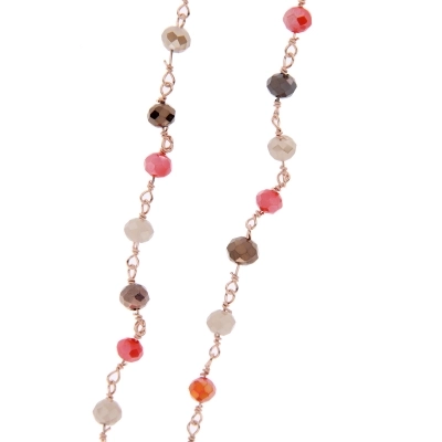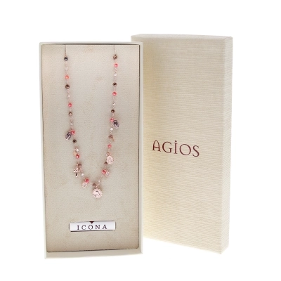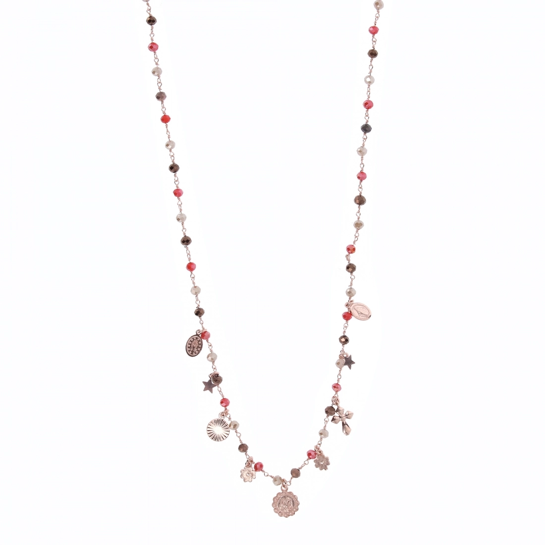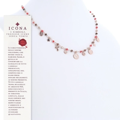 Bellissima collana girocollo della lunghezza di 37 cm + allungo 5 cm, realizzata in argento 925 rosè anallergico e pietre multicolor, di diametro 0,5 cm, sui toni dell'arancione (arancione, panna e marrone) 9 ciondoli sacri: angelo custode, Madonna Miracolosa, crocifisso alternati a cuori