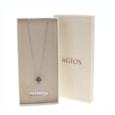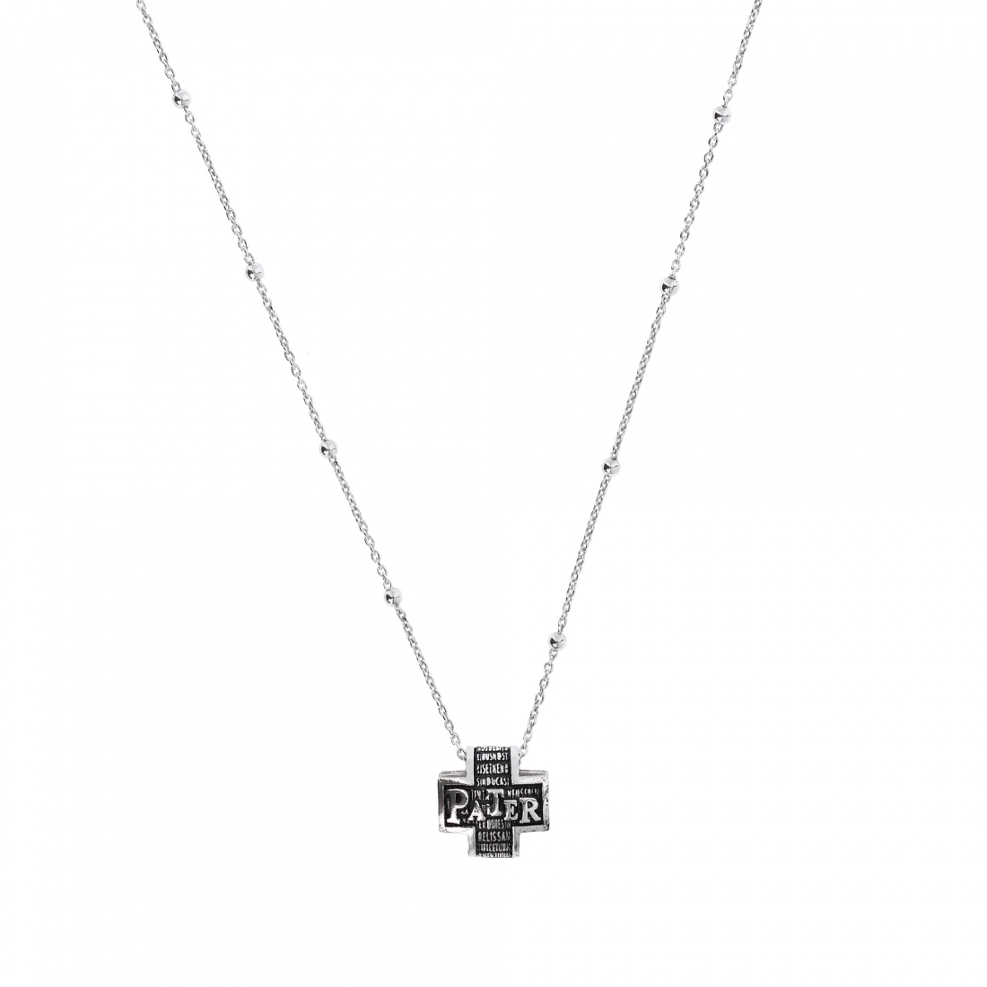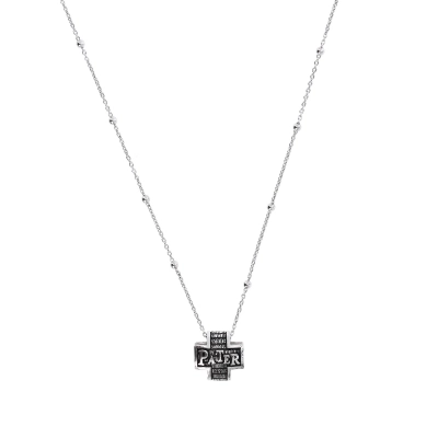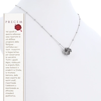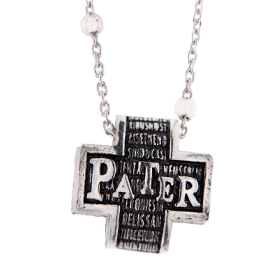La collana Precem Pater è un girocollo in argento 925 con croce pendente bombata, della lunghezza di 40 cm + 5 di allungo. La croce misura 1,5x1,5 cm e su di essa è riportata la preghiera del Padre Nostro in latino.