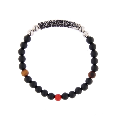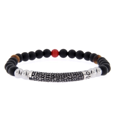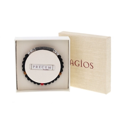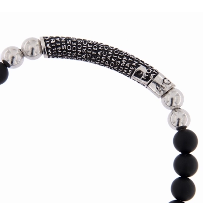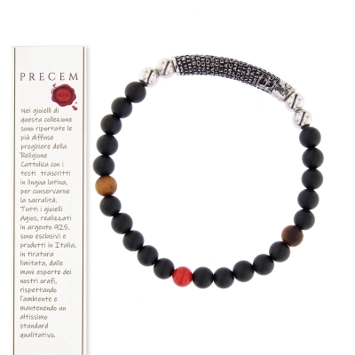 Bracciale Precem Mater con pietre nere naturali ed elementi argento rodiato brunito. Grano pietre 6mm, diametro bracciale 20 cm. Questo braccialetto ha come particolarità l'incisione del Padre Nostro in latino ed è un gioiello da indossare che unisce l'eleganza alla fede. Il Padre Nostro appresenta l'unica invocazione che Gesù ci ha consegnato e che Lui stesso utilizza per rivolgersi a Dio.