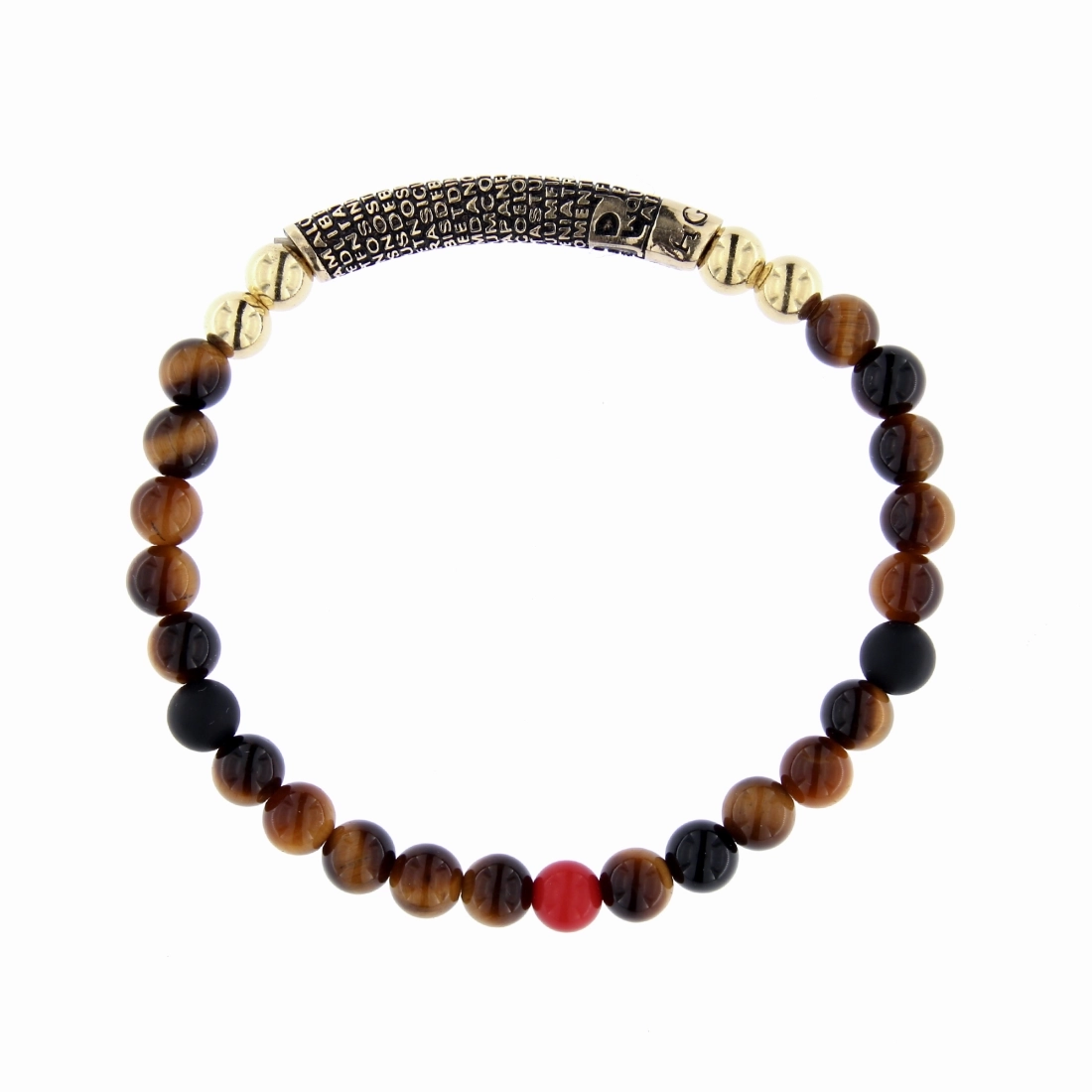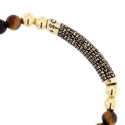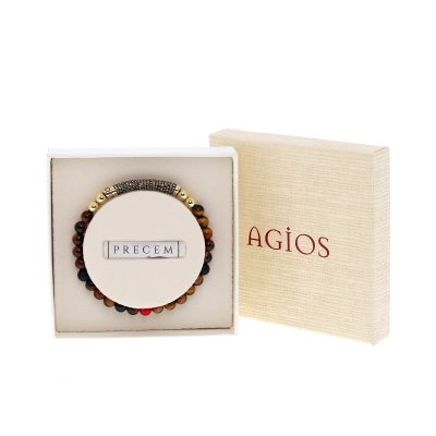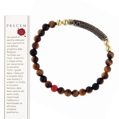 Bracciale Precem Mater con pietre nere naturali ed elementi argento dorato brunito. Grano pietre 6mm, diametro bracciale 20 cm. Questo braccialetto ha come particolarità l'incisione del Padre Nostro in latino ed è un gioiello da indossare che unisce l'eleganza alla fede. Il Padre Nostro appresenta l'unica invocazione che Gesù ci ha consegnato e che Lui stesso utilizza per rivolgersi a Dio.