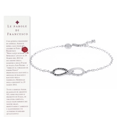 Delizioso bracciale della lunghezza di 20 cm in argento 925, con al centro un ciondolo che raffigura il simbolo dell'infinito dalle dimensioni di 2,5x1 cm su cui è riportata la celebre frase di Papa Francesco " Non farti rubare la speranza".