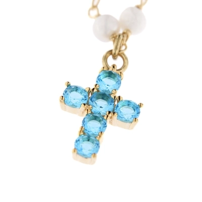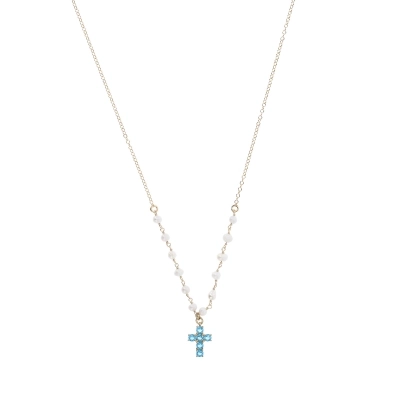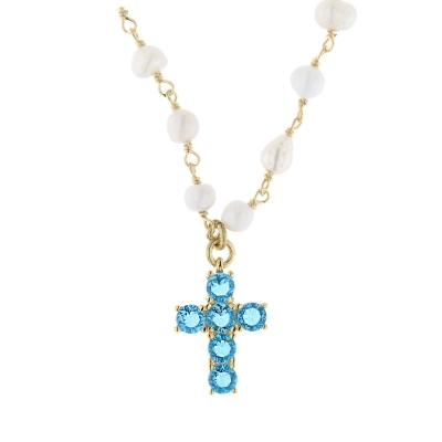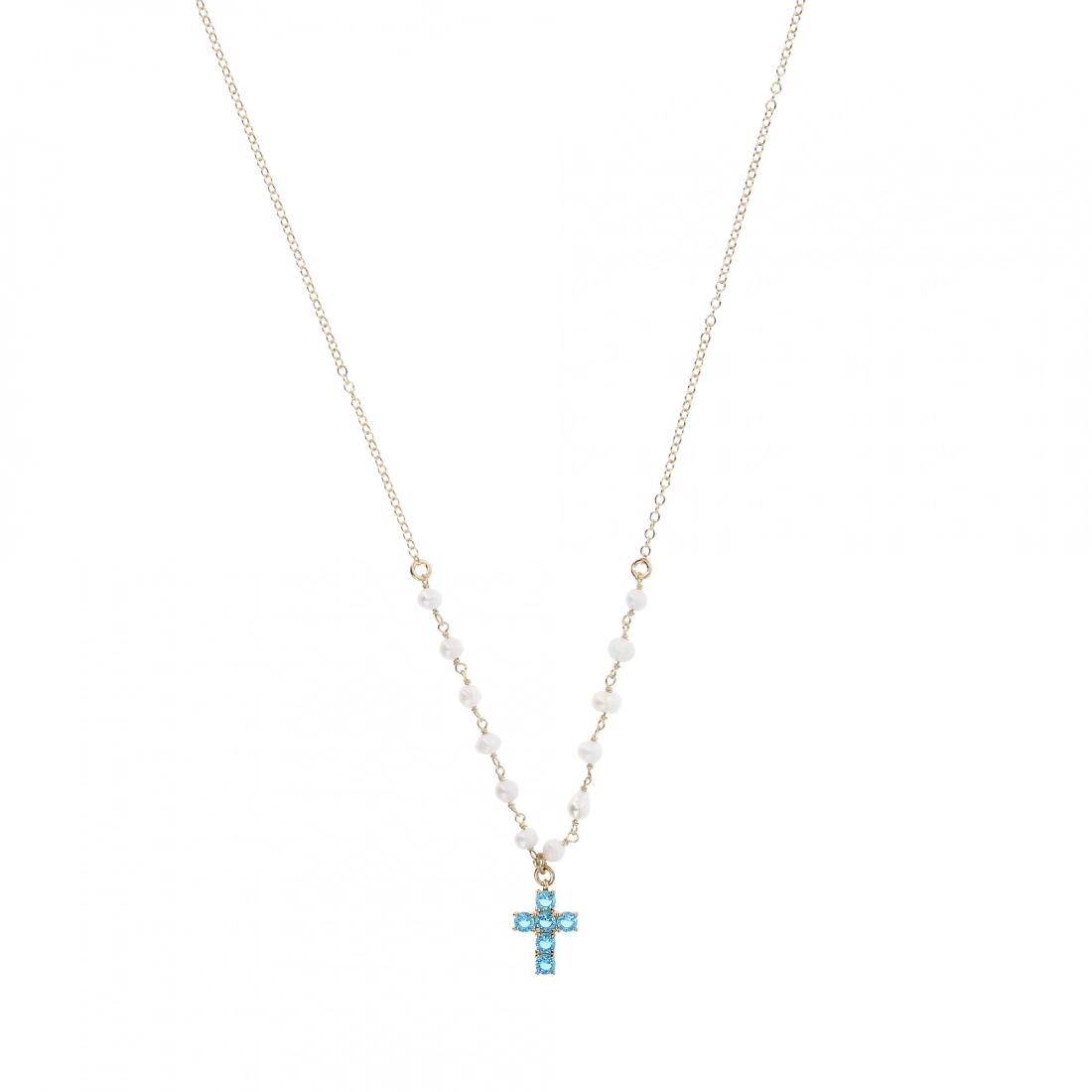Deliziosa collana della lunghezza di 40 cm più 5 cm di allungo, in argento 925 finitura dorata, con perle bianche irregolari dal diametro massimo di 0,5 cm e pendente con piccola crocetta di dimensioni 1,3x1 cm, impreziosita da zirconi celesti.